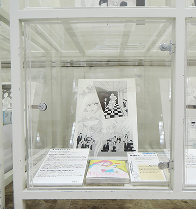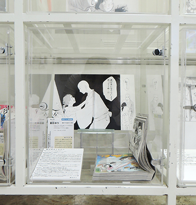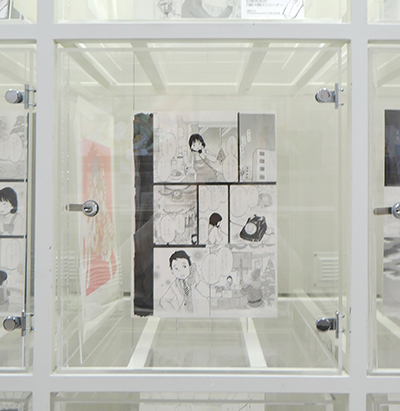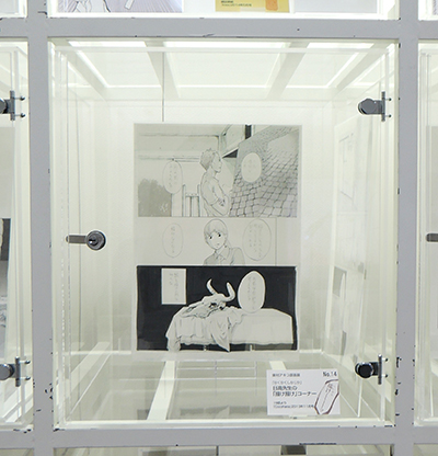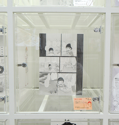 ケース09〜16および壁面左は「かくかくしかじか」特集。日高先生の「描け描け」コーナーと題して、主人公アキコの恩師・日高先生が全身全霊を込めて教えてくれた「描け」というメッセージのあるシーンを集めました。