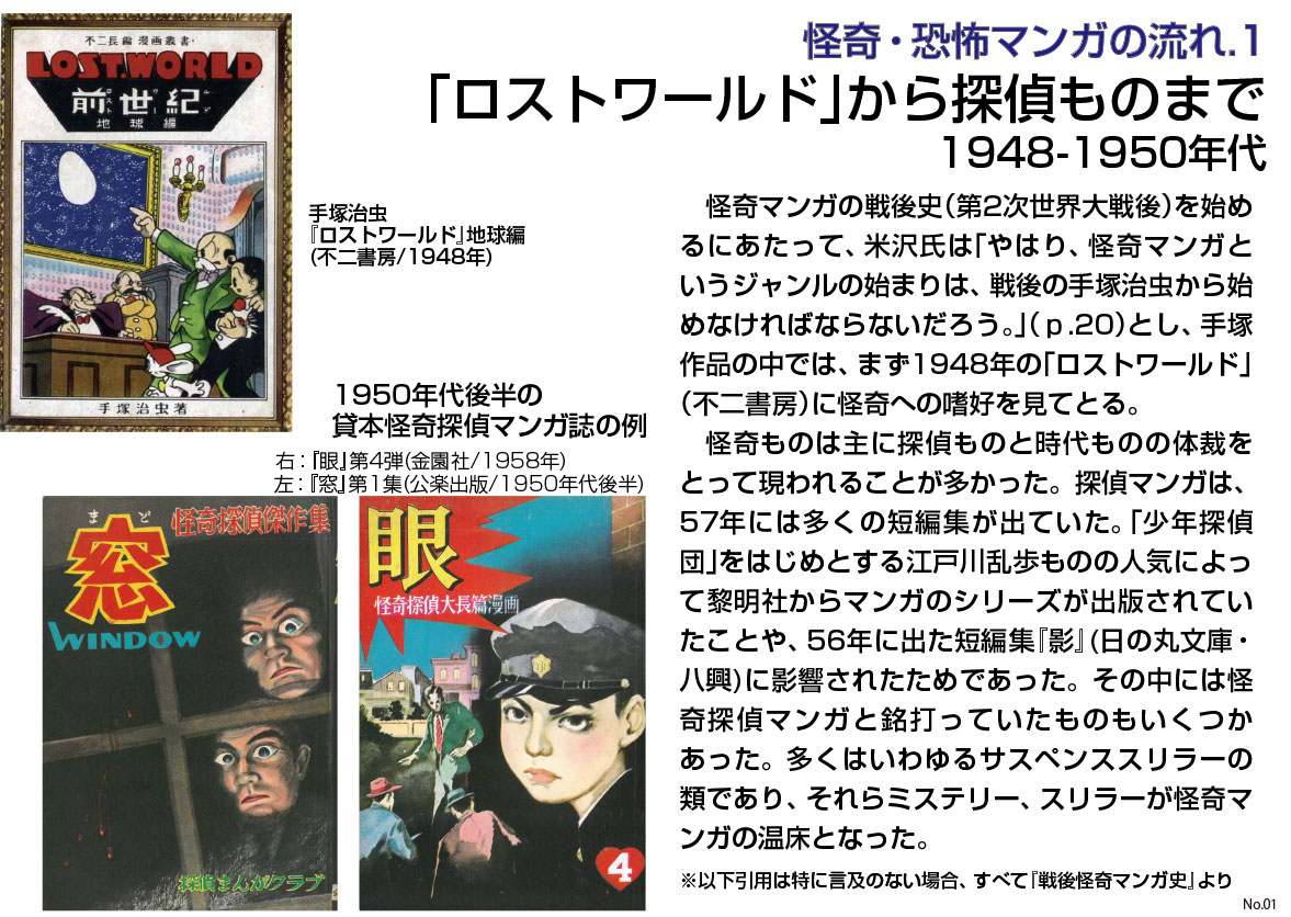 手塚の怪奇嗜好は、デビュー前に原型が描かれていた1948年の「ロストワールド」で既に現われている。同作の地球編は、影を使ったミステリアスな仕掛けであり、登場する悪人たちの姿形は実にグロテスクだった。同年の「魔法屋敷」には、魔法は科学によって打ち破るべきものといったテーゼがあるが、手塚の中には、不合理なもの、怪奇への愛着があったに違いない。さらに同年の「妖怪探偵団」では、異形の人間・妖怪たちの、自身を疎外する世の中への復讐が描かれる。それは後の「アラバスター」(1970-71年『週刊少年チャンピオン』)に通じるテーマだ。