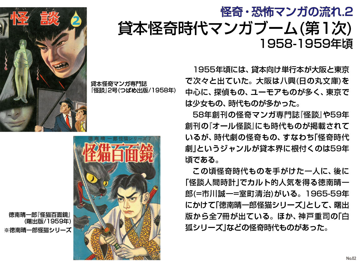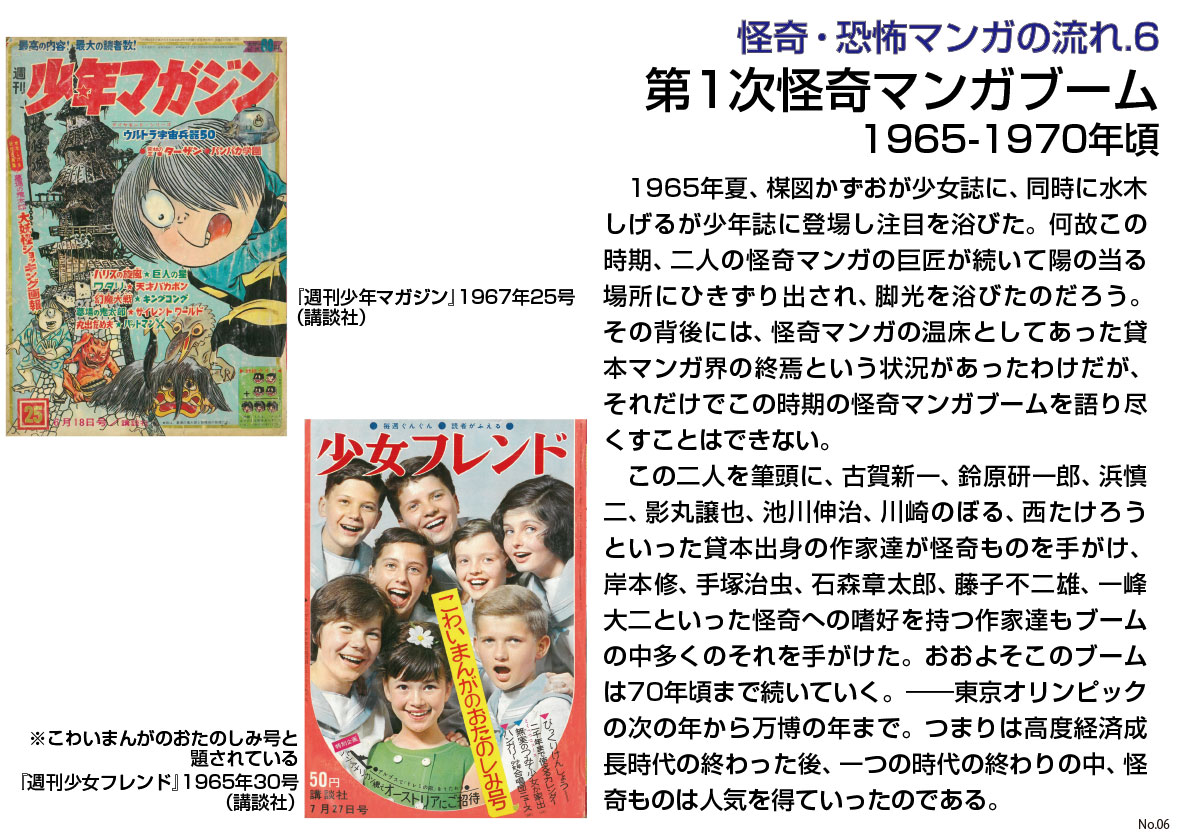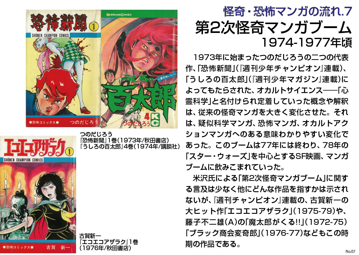 1970年以降の15年間は、個々の作家、つまり、山岸凉子、萩尾望都、あしべゆうほ、山田ミネコ、高階良子、ささやななえ(ななえこ)、山上たつひこ、諸星大二郎、永井豪、池上遼一、和田慎二、日野日出志、わたなべまさこ、美内すずえ、大友克洋、石井やよひ、柿崎普美、竹宮恵子(惠子)、木原敏江、つのだじろう、手塚治虫、石森章太郎、藤子不二雄……と何故かマンガ家として一流の作家の、怪奇の流れにある仕事を見ていけばいい。