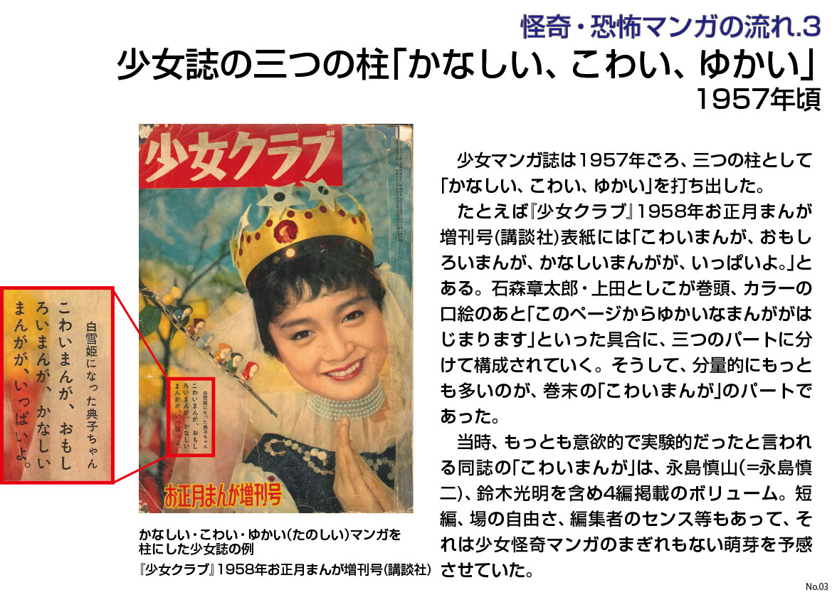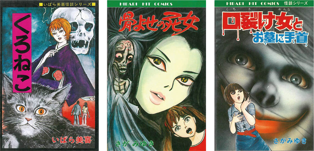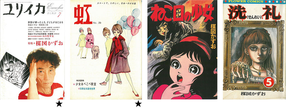 貸本で怪奇時代ものが定番となりつつあった1958年、楳図かずおは『少女ブック』増刊に「雪おんな」、ふろくに「お百度少女」を発表し、以降少女怪奇マンガを次々に発表していく。59、60年だけでも、貸本短編誌や大手出版社の雑誌に「おみっちゃんが今夜もやってくる」など8作もの少女ものを立て続けに掲載している。楳図が、その後少女ものの中で描き続けることになる形状のグロテスク、肉体の変貌の恐怖を少女マンガの中で初めて描くのは61年の「口が耳までさける時」(『虹』9号)でということになる。