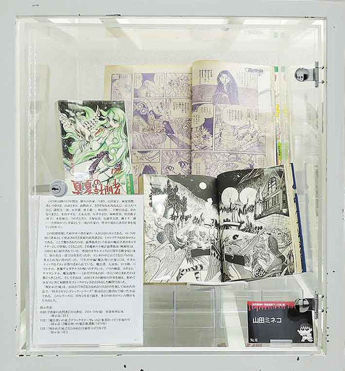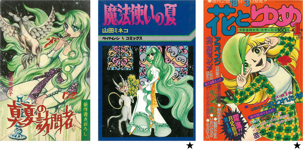 この時期登場した紹介すべき作家の一人が山田ミネコである。69-70年頃に貸本として発表された『真夏の訪問者』は、ミステリアスな怪奇ロマンである。ここで驚かされたのは、澁澤龍彦という名前の魔法学者がキャラクターとして登場してくることだ。『黒魔術の手帖』(澁澤龍彦/桃源社)は、当時日本に紹介されていた、 外国のオカルティズムに関する数少ない本で、彼の名は一部では有名だったが、マンガの中に出てくるというのは、考えられない時代だった。71年の中編「魔法使いの夏」には、オカルティックなイコンが散りばめられている。魔法書、人面鳥、ミトラ神、バフォメット、悪魔サルガタナスの呪いのタブレット、バラの幽霊、コボルト、サラマンテル、魔女裁判……これだけのものが一作につめこまれたのは驚くべきことだ。そしてそれは、山田ミネコの趣味の世界を超え、初めて少女マンガに本格怪奇ゴシックロマンがお目みえした瞬間であった。