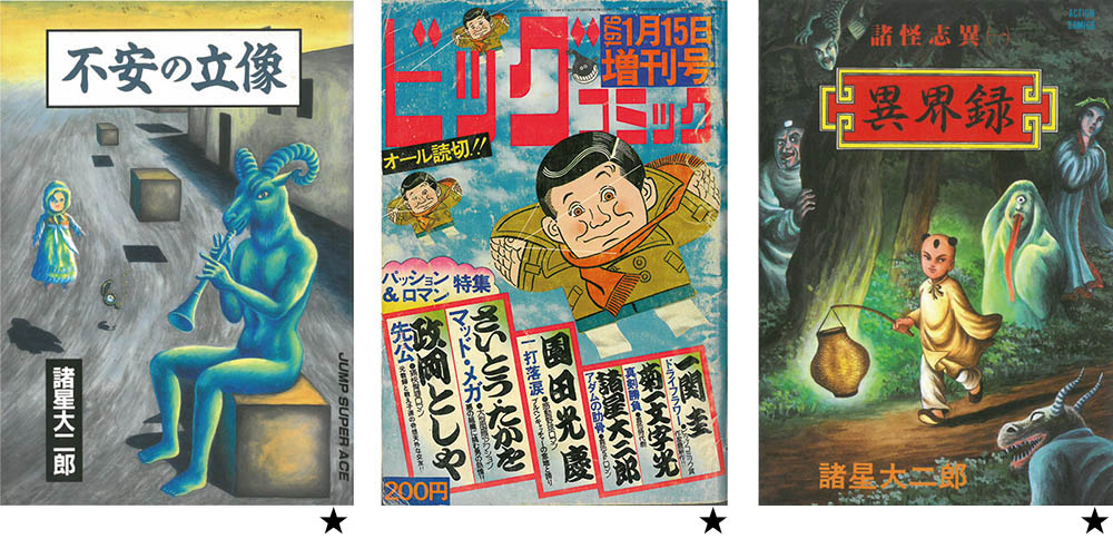 諸星はSFマンガでも、アクションやバトルとは無縁の「奇妙な異世界」を描いていた。線ではなく面や塊を描こうとするスタイル、インパクトのあるオブジェ、怪物、風景によって物語世界は、不気味で忌まわしい怪異に満ちていた。「アダムの肋骨」(1976年)では人面鳥の住む惑星が描かれる。