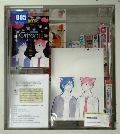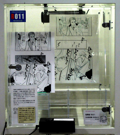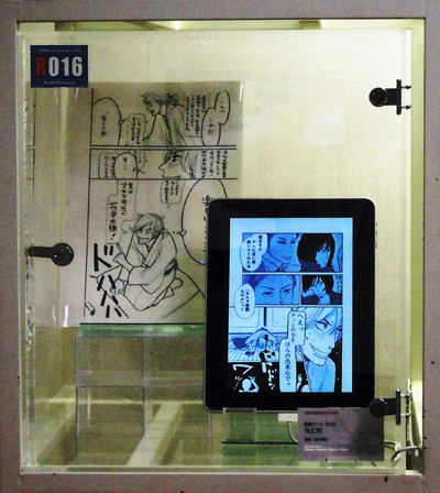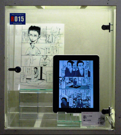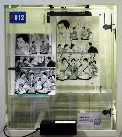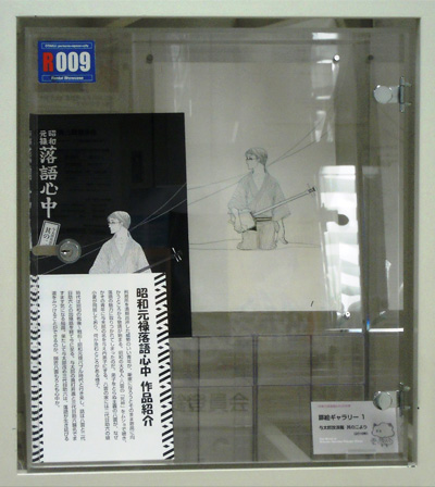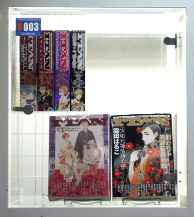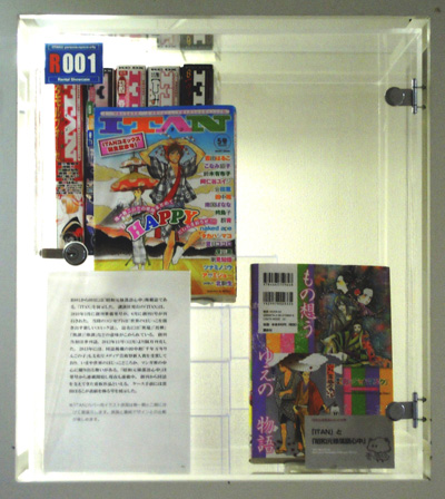 R001から003には「昭和元禄落語心中」掲載誌である、「ITAN」を展示した。講談社発行の「ITAN」は、2010年3月に創刊準備零号が、6月に創刊1号が刊行された。当時のコンセプトは「世界のはじっこを描き出す新しいコミック誌」。誌名には「異端」「畏憚」「異譚」「偉譚」などの意味がこめられている。創刊当初は季刊誌、2012年11号(12月)より隔月刊化した。2013年には、同誌掲載の田中相「千年万年りんごの子」も文化庁メディア芸術祭新人賞を受賞しており、いまや世界のはじっこどころか、マンガ界の中心に躍り出る勢いがある。「昭和元禄落語心中」は零号から連載開始し現在も連載中。創刊から同誌を支えてきた看板作品といえる。ケース手前には雲田はるこが表紙を飾る号を展示した。