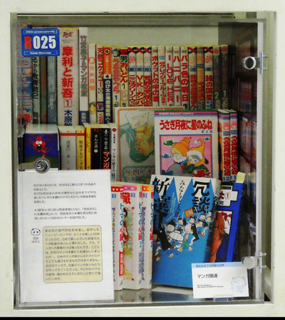 幼いころの思い出の品から、マンガに関するものを展示した。緑のドラえもんに「雲」が描き足されていることに注目してほしい。