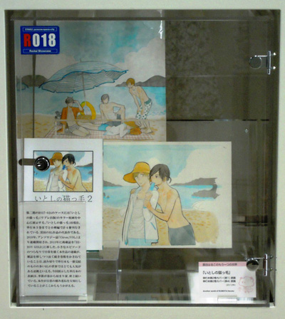 第二期のR017-024のケースには「いとしの猫っ毛」(リブレ出版)のカラー原画を中心に展示する。「いとしの猫っ毛」は現在、単行本3巻までと小樽編で計4冊刊行されている、雲田のBL作品の代表作である。2010年、アンソロジー誌「Citron」VOL.1より連載開始され、2013年に掲載誌を「BE・BOY GOLD」に移した。小さなエピソードのつらなりで日常を描く本作品の連載が、雑誌を移しつつ長く続き巻数をかさねていることは、読み切りで単行本も一冊完結のものの多いBLの世界ではとても人気がある証拠といえる。今回展示した単行本の表紙は、季節が春から始まり夏、秋と続いている。本作が日常の積み重ねを大切にしていることがここからもうかがえる。