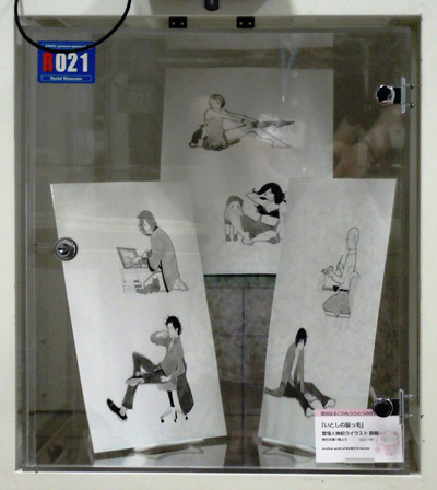 「いとしの猫っ毛」 web告知用イラスト原画(額) サイン会カード用イラスト原画(奥) ポップ用イラスト原画(手前右) 寒中お見舞い用イラスト原画(手前左) (2011年)