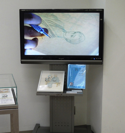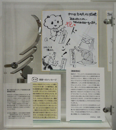 雲田はるこの「昭和元禄落語心中」は、第17回文化庁メディア芸術祭優秀賞を受賞した。ケース内は、みなもと太郎による贈賞理由全文、トロフィー、2月8日(土)に行われた受賞記念イベント「落語の粋をマンガに-『昭和元禄落語心中』の達成-」時の記念色紙、そして本展示のために寄せられた、雲田はるこ自身による受賞コメントである。