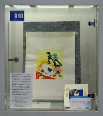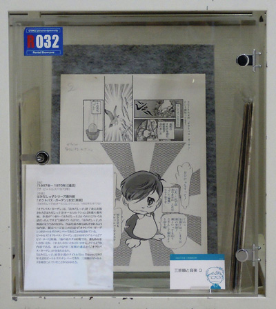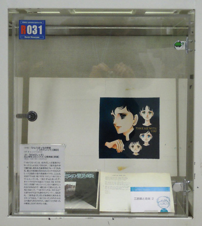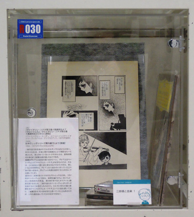 三原作品では音楽がタイトルやモチーフになることが多い。R030-032には、音楽に関する原画とレコード類をならべて展示した。展示されているレコードやカセットは、書物同様その多くが三原順自身が遺したものである。