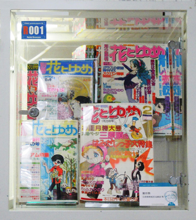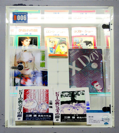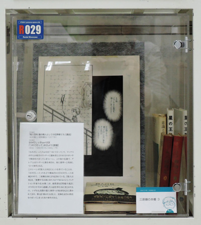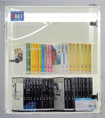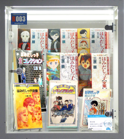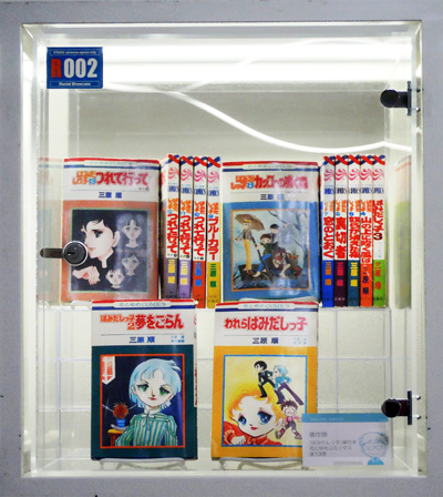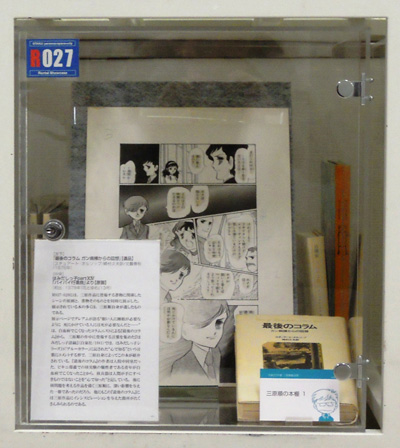 R027-029には、三原作品に登場する書物に関係したシーンの原画と、書物そのものとを同時に展示した。展示されている本の多くは、三原順自身が遺したものである。