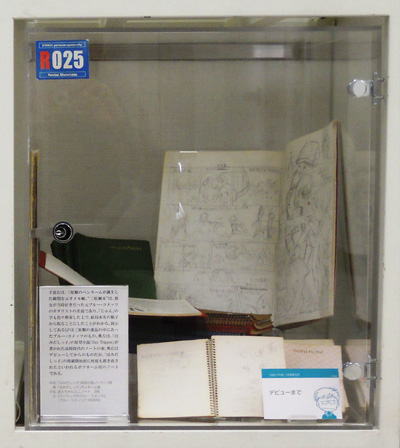 手前右は、三原順のペンネームが誕生した瞬間を示すメモ帳。"三原綱木"は、彼女が当時好きだった元ブルー・コメッツのギタリストの名前であり、「じゅん」の字も色々模索した上で、結局本名の順子から取ることにしたことがわかる。展示してあるLPは三原順の遺品の中にあったブルー・コメッツのもの。奥左は、「はみだしっ子」の原型小説「Day Tripper」が書かれた高校時代のノートの束。奥右はデビューしてからのものだが、「はみだしっ子」の掲載開始前に何度も描き直されたといわれるボツネーム用のノートである。