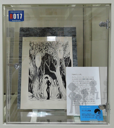 また、隣のR029もそうだが、階段が登場する印象的なシーンが三原作品には時々登場する。三原順と階段といえば、「天国への階段」である。展示した遺品のレコードにも収録されているこの曲は、彼女が創作中に繰り返し聴いていたことで知られている(「特別対談 三原順v.s.くらもちふさこ」『はみだしっ子全コレクション』より)。「階段のむこうには…」では、グレアムの自殺した叔母のことを「おばちゃまは自殺によって天国への階段を踏み外した」と描かれており、このPart全体を通して、この曲のイメージが色濃く感じられる。