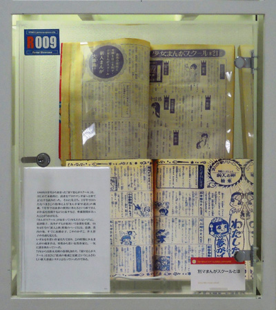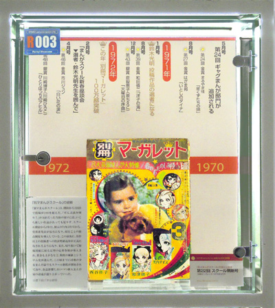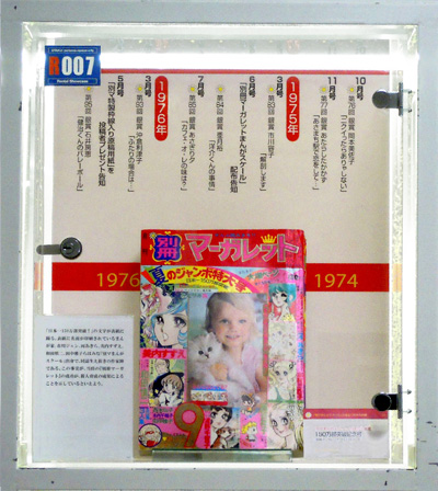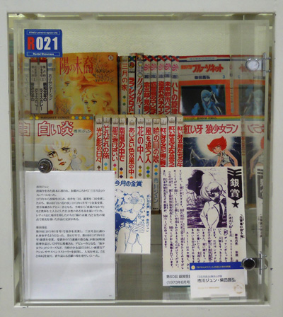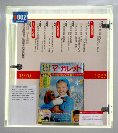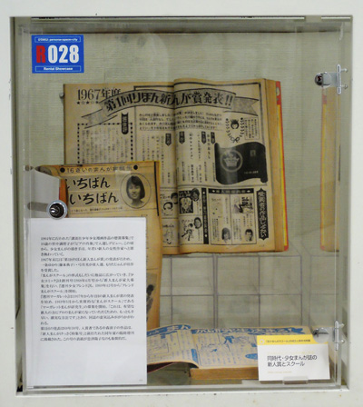 別マまんがスクールの出身者はここでは紹介しきれない。河あきら、沖倉利津子、亜月裕、大谷博子など別マを担った作家たちなど、ケースの中になるべく大勢の作家名がみえるよう並べるのが精一杯である。本ケース左側面にも注目してほしい。そこに並ぶ作家はみな投稿者であった。萩尾望都のように金賞受賞者ではあったがデビューは他の雑誌であるものもいれば、木原敏江のようにデビュー後同誌に作品を発表しつつも、活動場所を移動していった作家もいる。例として萩尾望都(第11回1968年5月号)と、木原としえ(第15回1969年1月号)の金賞受賞の選評ページを開いて展示した。
