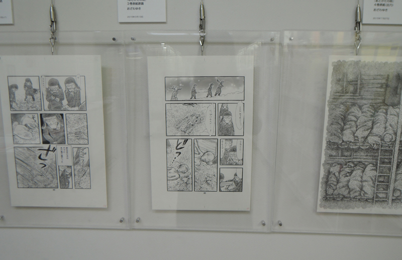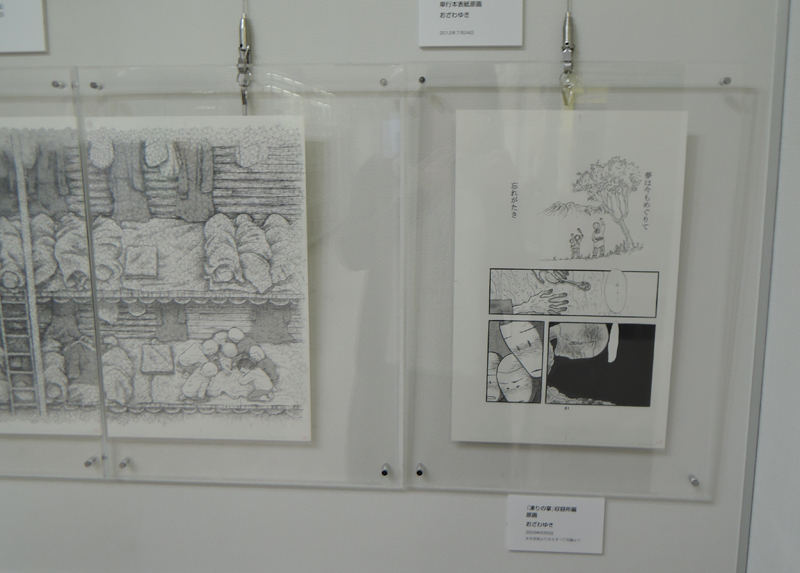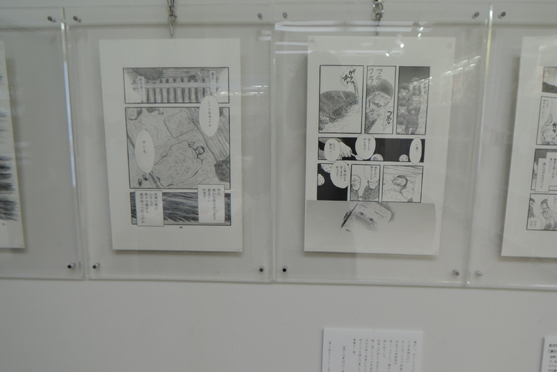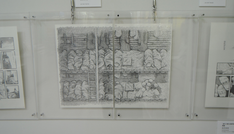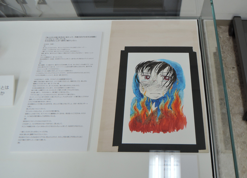 太平洋戦争末期は、本土でも大都市を中心に大規模な空襲に見舞われた。その一つ、名古屋を舞台に、戦時下の日常を生きる家族を、一人の少女の目を通して描く。父親のシベリア抑留の体験をもとに「凍りの掌」を描いた作者が、今度は、名古屋大空襲を生き延びた母親をモデルに、実際に体験していない戦争の記憶を、受け継ぎ、伝える、ということに再び挑む。今回、テーブルケースに展示されているテキストは、作者が母親へのインタビューの文字おこし。本作が持つリアリティーを支える秘密の一端である。