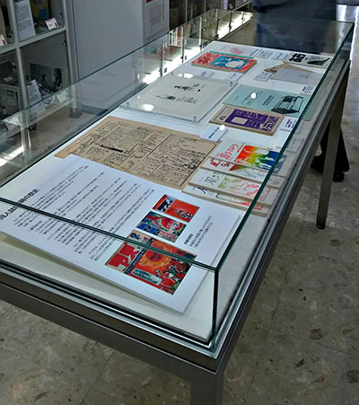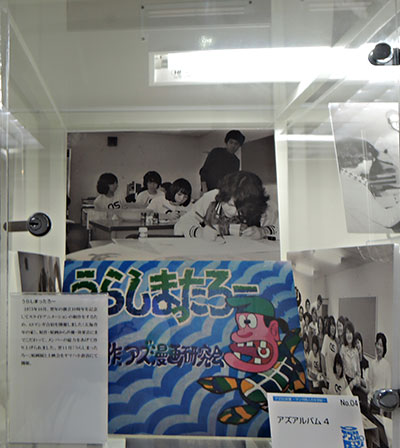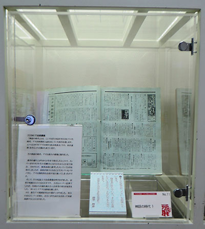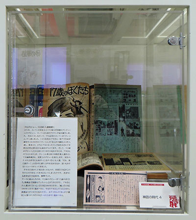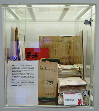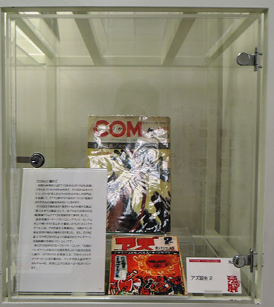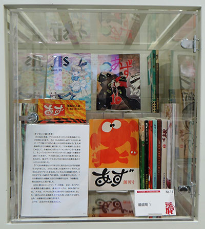 ケースには、今回の展示のもととなった、北九州市漫画ミュージアムでおこなわれた『アズ50年展』図録と、畑たいむの仕事の一部を紹介しています。