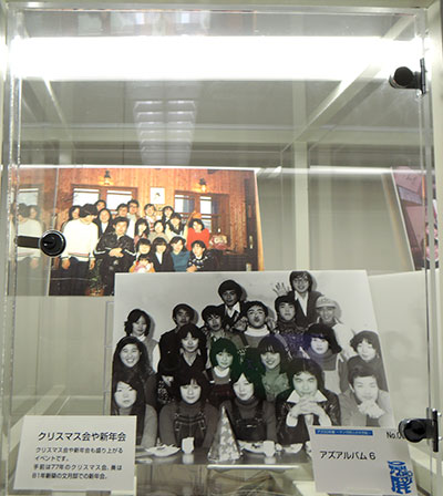 写真パネル中央は、1978年に北九州の夜宮青少年センターでおこなわれた例会の様子です。中央後手前は、1968年に会員が選ぶ最優秀作品賞として設けられた「アズ賞」の第4回授賞式。大賞は高木峰代(おやぶん)。