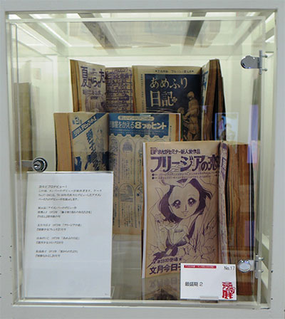 ケースに展示したのは、マコ姉のデビュー作「17歳の冒険」掲載誌(『別冊セブンティーン』12月号)。アキさんの入選2作「白い心」(『COM』1968年5月号)、「風」(『COM』1968年12月号)選評パネル、やはりアキさんの「ひととせの」掲載誌(1971年『COM』8月号)。おケイさんの「まんが予備校」入選(1971年『COM』5 ・6月合併号)選評パネル。