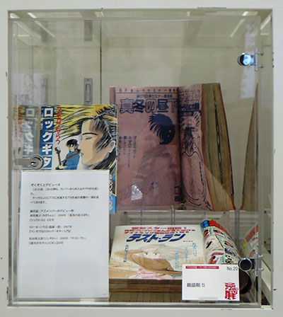 ケースNo.20にシンタローさんのプロデビュー作掲載誌、壁に代表作「NOボーイ」の原画が展示してあります。原画はひと月ごとに展示替えをおこないます。