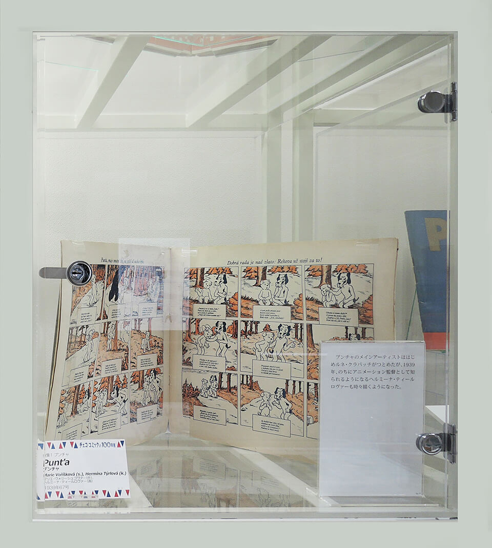 このコーナーでは、現代チェコ・コミックを代表する作家たちを特集し紹介した。会期ごとにひとりの作家をピックアップし、壁で原画展示を行い、中央の覗き込みケースでは残り3人の現代作家を書籍とともに紹介した。