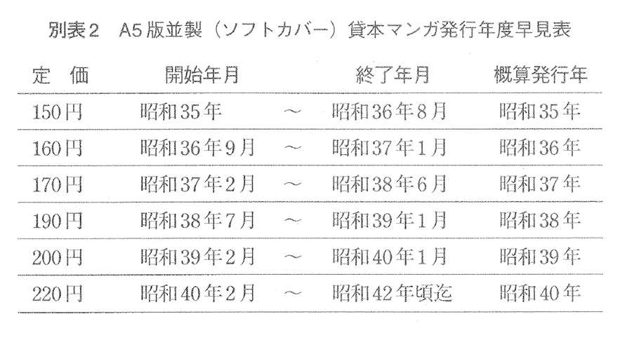 貸本マンガの発行年度の推定法はいくつかある。まず、A5判並製本(ソフトカバー)の単行本や短編誌であれば、基本的には1960年以降の刊行ということになる。以下は、A5並製本の発行年度の確定方法ということになる。