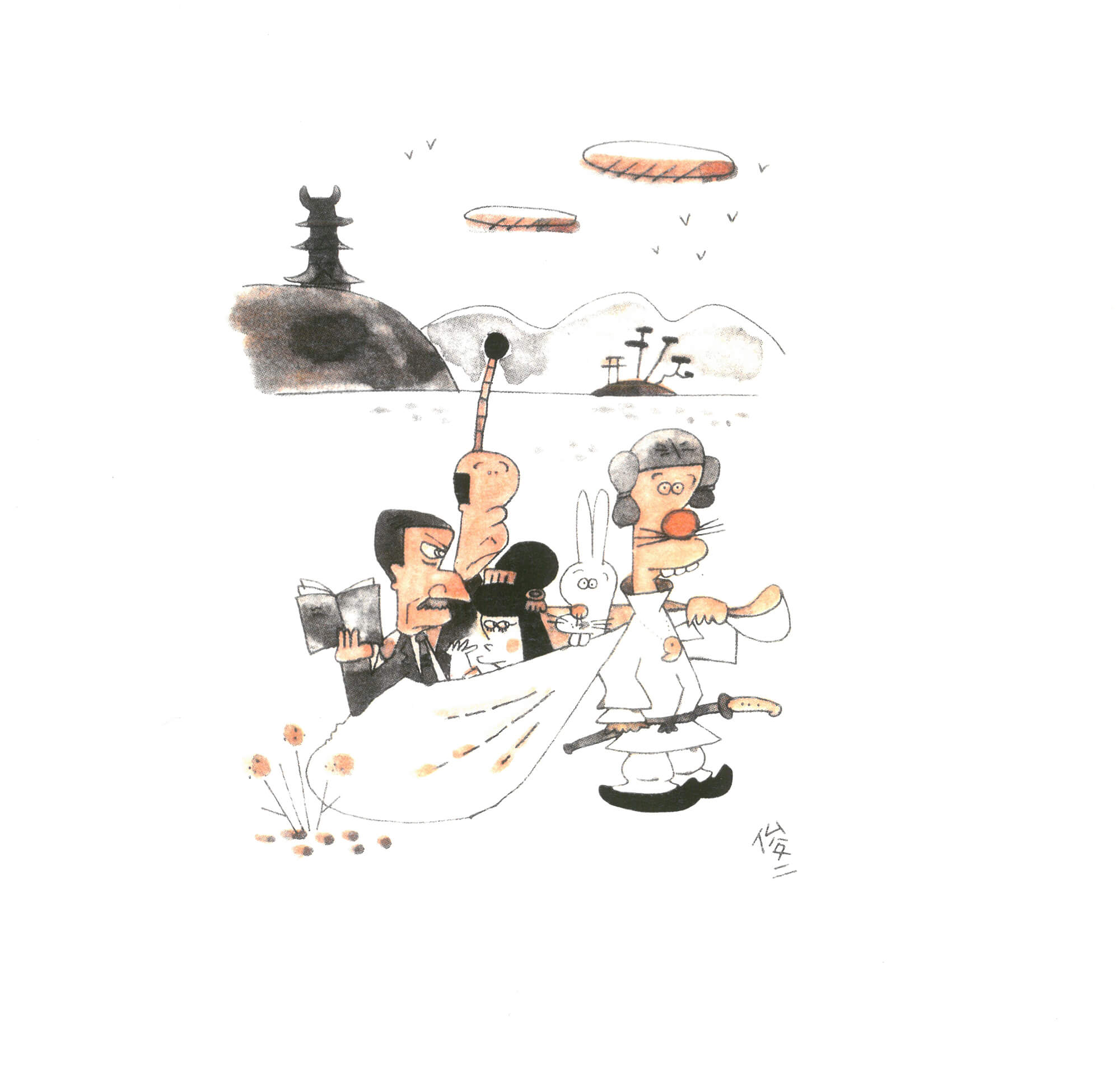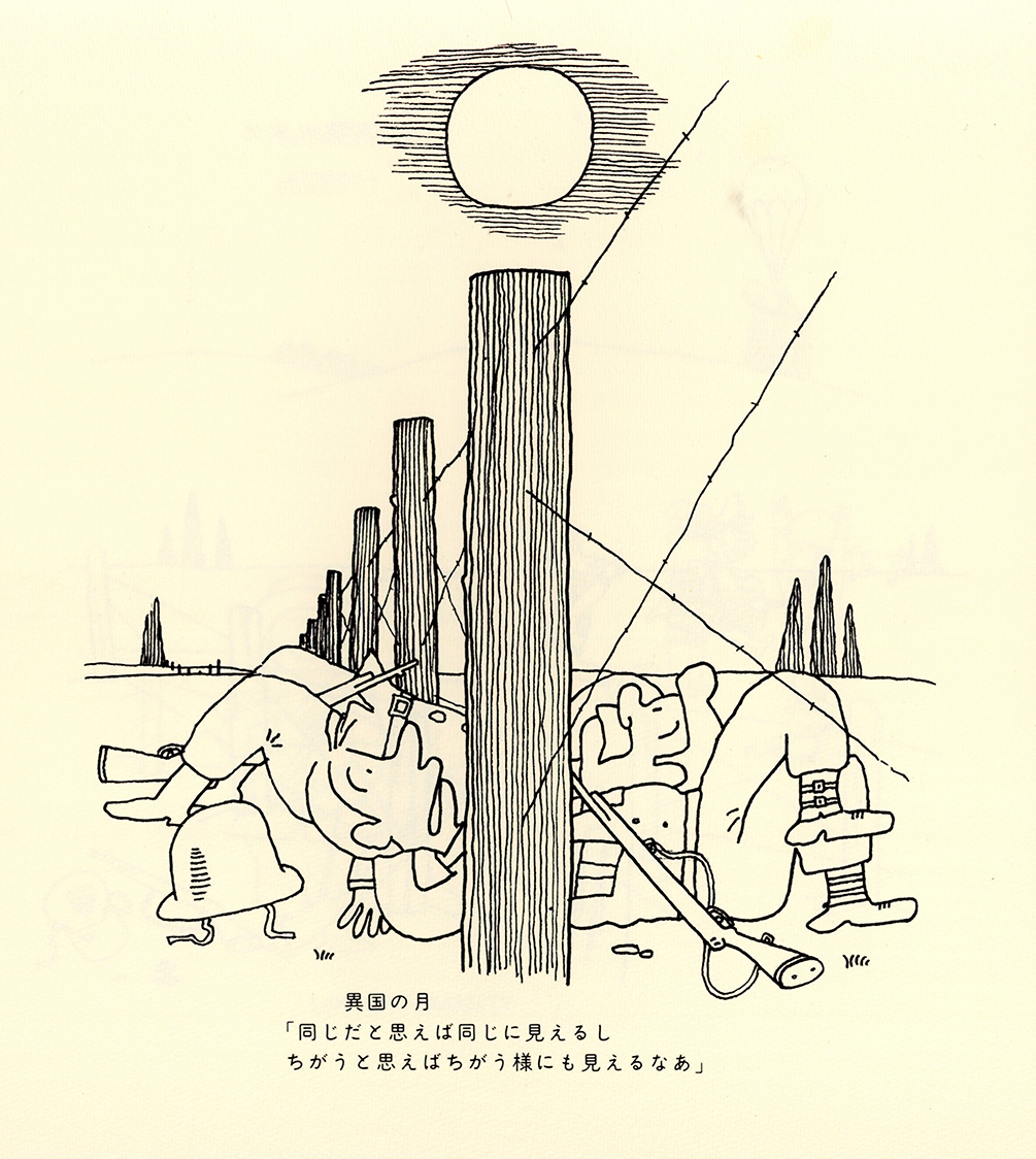 デビューして数年間、園山俊二は子供マンガだけを描いていましたが、大人に向けたマンガも描きたいという希望を持っていました。そこで、「がんばれゴンべ」以外の連載を思い切ってすべてやめて、一人で世界一周旅行に出ました。この旅行で得た経験と、それまで考えていたことやアイデアをまとめて自費出版したのが「国境の二人」です。そしてこれを契機に、大人マンガへの挑戦をはじめた園山にとっての転機となる、重要な作品です。内容の面でも、国家間の争いを目にして、平和を願い、自由を制限するものへの反抗という、この後繰り広げられる園山マンガの世界を彷彿とさせています。