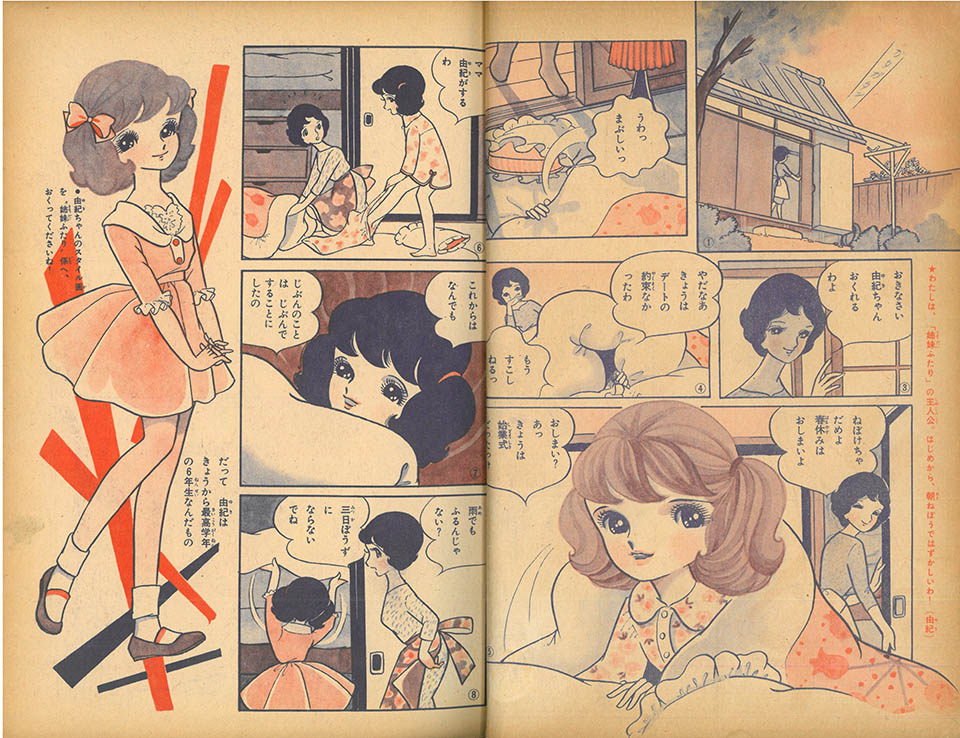雑誌では高橋真琴のバレエマンガ「あらしをこえて」(『少女』』1958年1月号)で初めて登場したとされています。高橋は「新しい少女マンガのスタイルを目指していた私は、マンガのコマ割りに関係なく、見開きページを構成し、少女ファッションとして好きなように描いていました」と述べています。