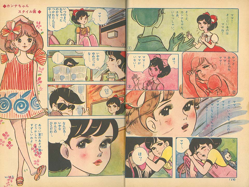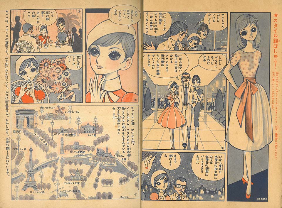 ちなみに、コーナー3-4、1961年の『少女』では「スタイル絵」とされており、こちらの1966年の『小学四年生』では「スタイル画」とされています。これは「スタイル画」の形式と呼び名が一過性のものではなく、教養誌的側面のあった小学館の学年誌掲載の少女マンガにも描かれるほどに、表現として根づいていたことが分かる例でもあるでしょう。