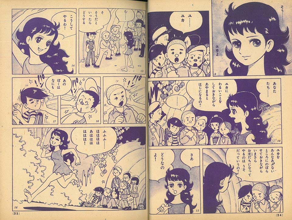 1959年、ちばてつやは少女向けの悲しいお話を描くのがだんだん辛くなり、「ユカをよぶ海」連載第2回に、意地悪してきた男の子をひっぱたくような少女を描いてしまいました。編集者には人気が落ちると言われましたが、実際は「そこが面白かった!」と大反響。「そこからふっ切れましたね。ああ、女の子って悲しいものだけが好きじゃないんだ、元気な、活発で思ったこと言いたいことをパッと言うような明るい子もいいんだなっていうことに気がついて。それからぼくはもう少女ものということを意識するのをやめまして、男の子が読んでも女の子が読んでも面白ければいいんだと、そこからすごく楽になりましたね」