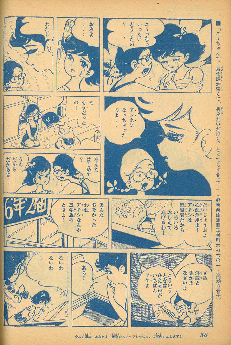 少女雑誌においては1960年代前半まで初潮の話題はタブー視され、生理用品の広告さえも保護者から非難の対象となっていました。女の子の初潮をマンガで最初に扱ったのは、1963年、望月あきらの「わたしは……東京っ子!」の連載中だと言われています。本作は、読者投稿を元にしたエピソードが主人公ユミの体験として綴られる作品です。当時は初潮のことを「アンネ」と呼んでいます。
