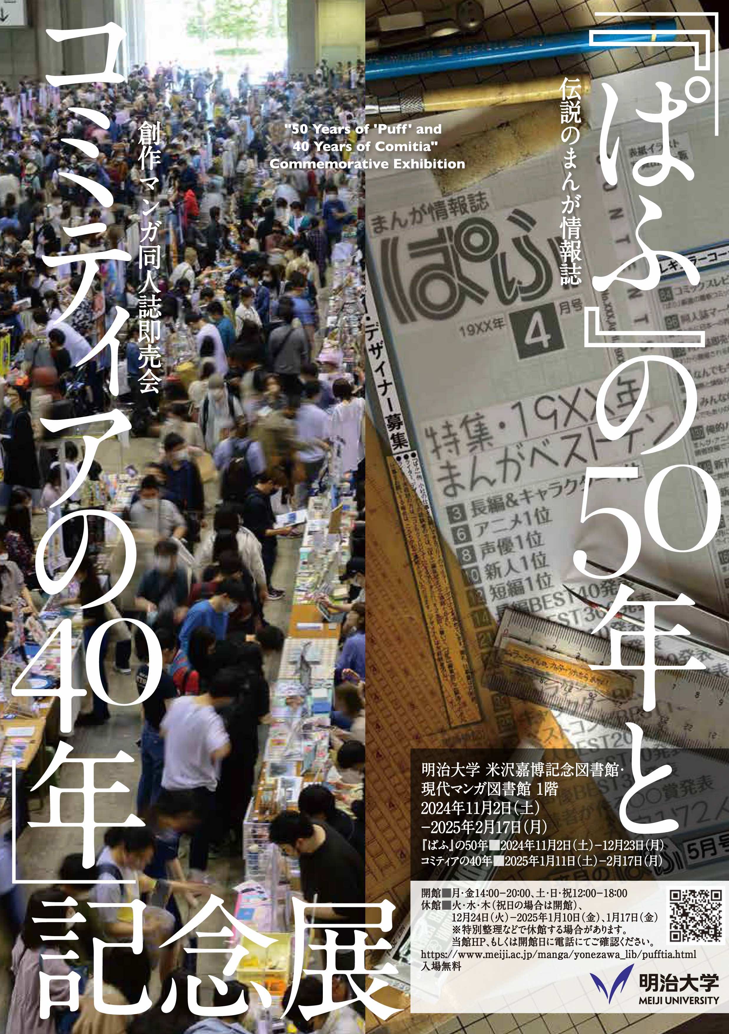 本展示は、会期の前半は創刊から50年の節目にあたる『ぱふ』、後半は開催150回を数えるとともに40周年を迎えるコミティアのこれまでを紹介し、両者をゆるやかにつなげる記念展です。