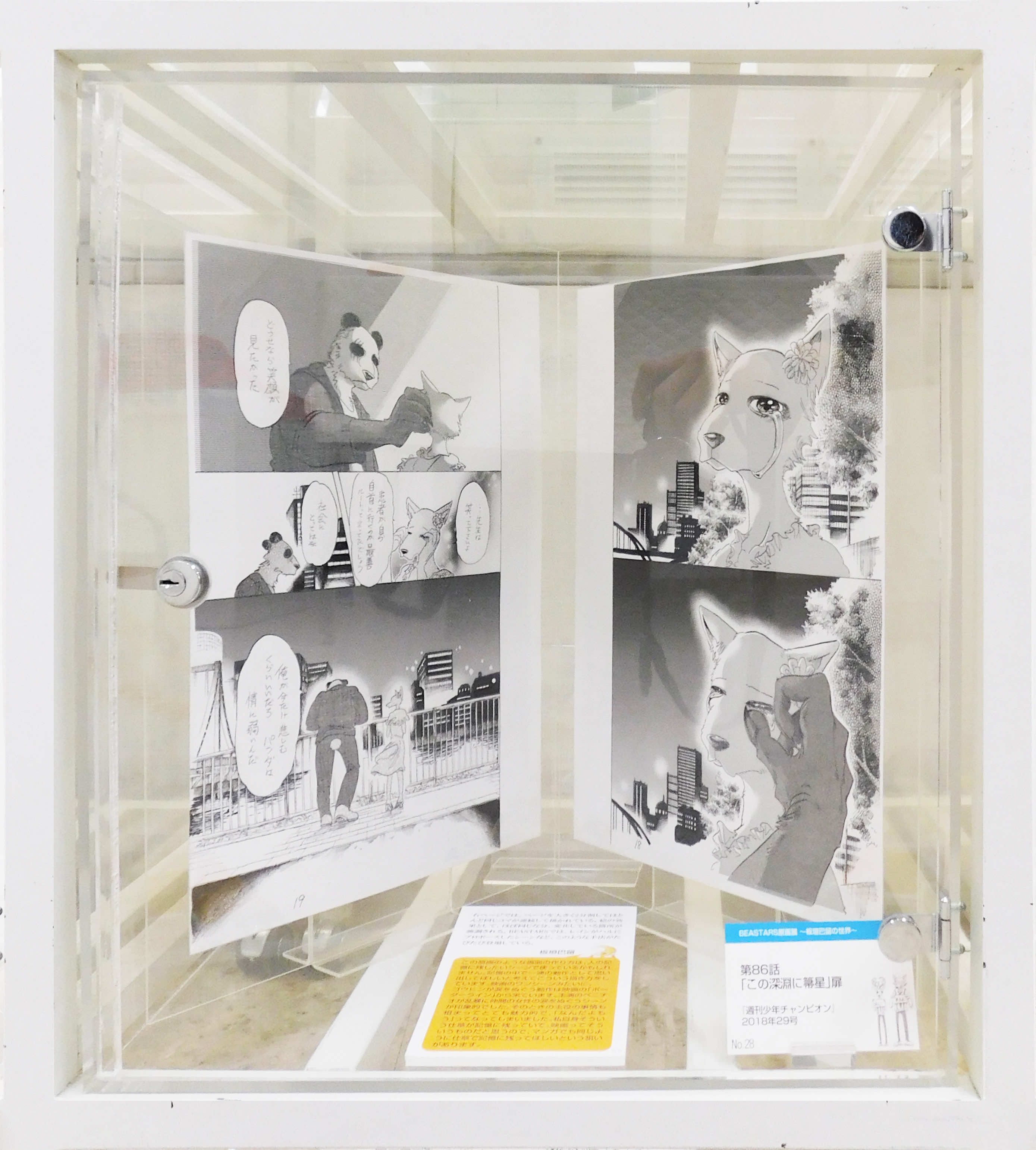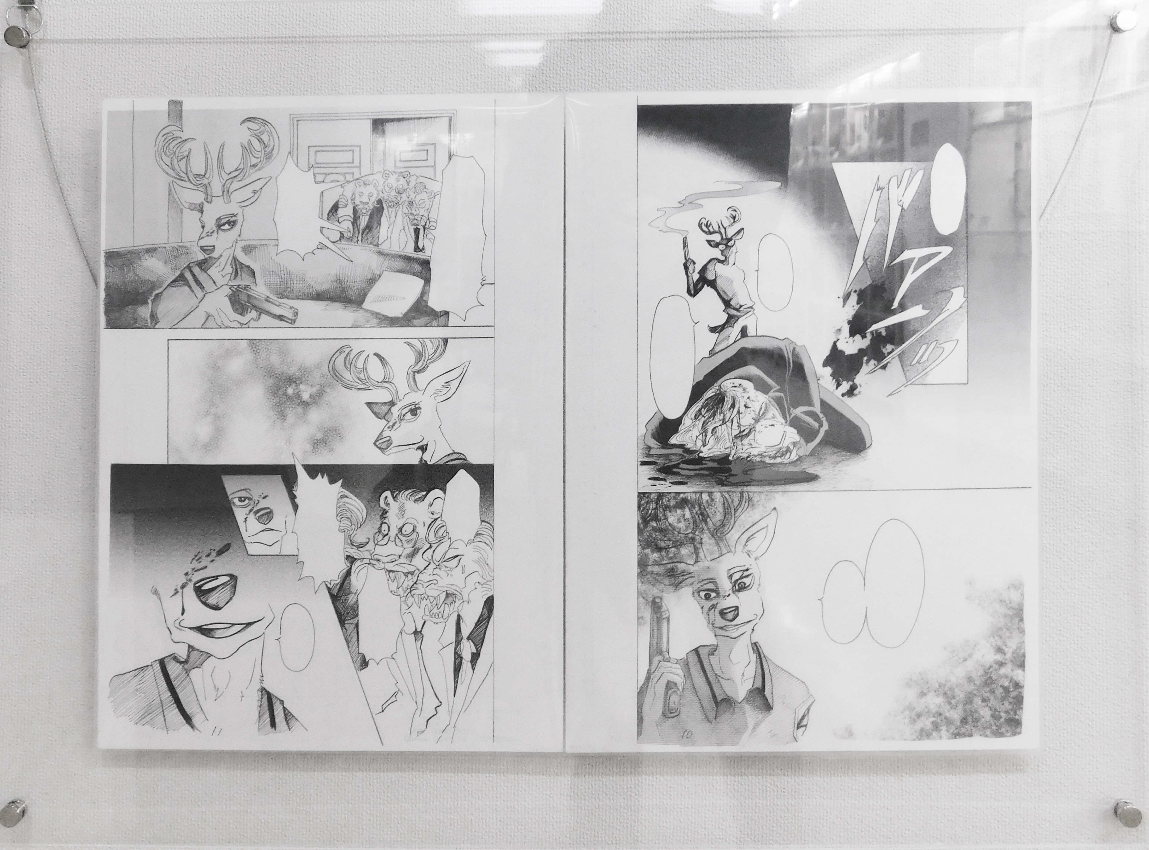 右ページでは、ページを大きく2分割してほとんど同じコマが連続して描かれている。絵の効果として、ほぼ同じな分、変化している箇所が強調される。BEASTARSでは、レゴシがハルにプロポーズしたシーンなど、このような手法がたびたび登場している。