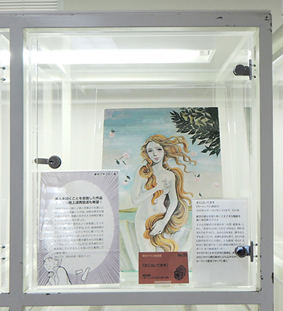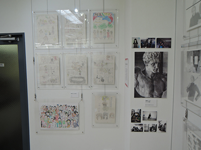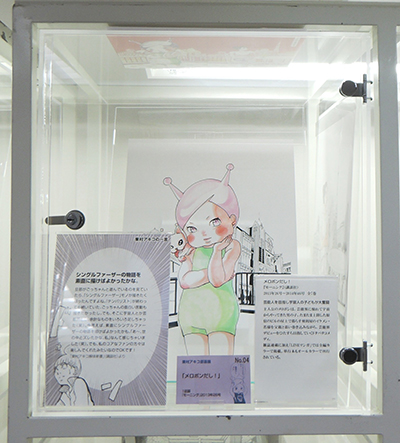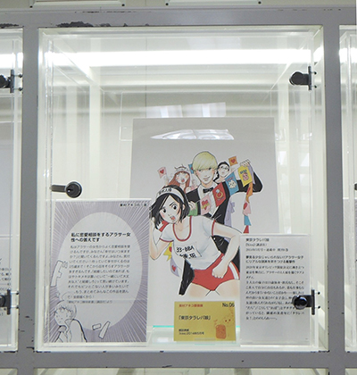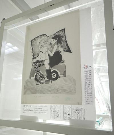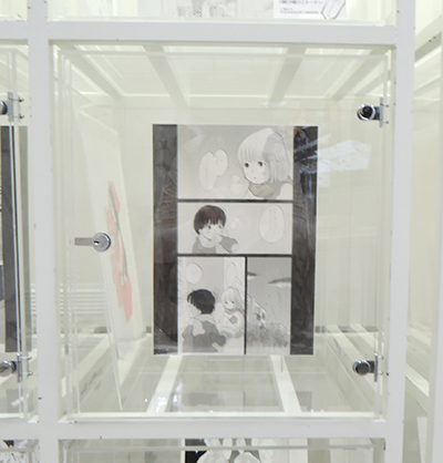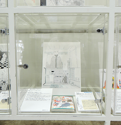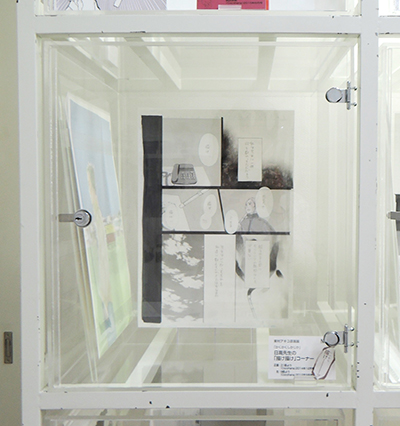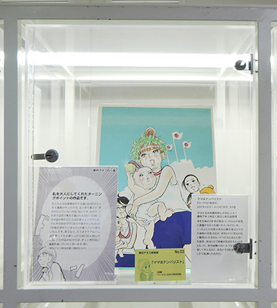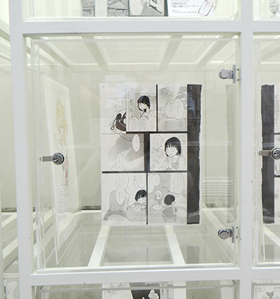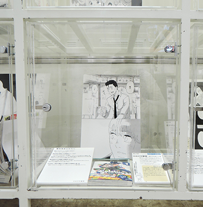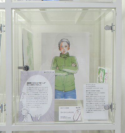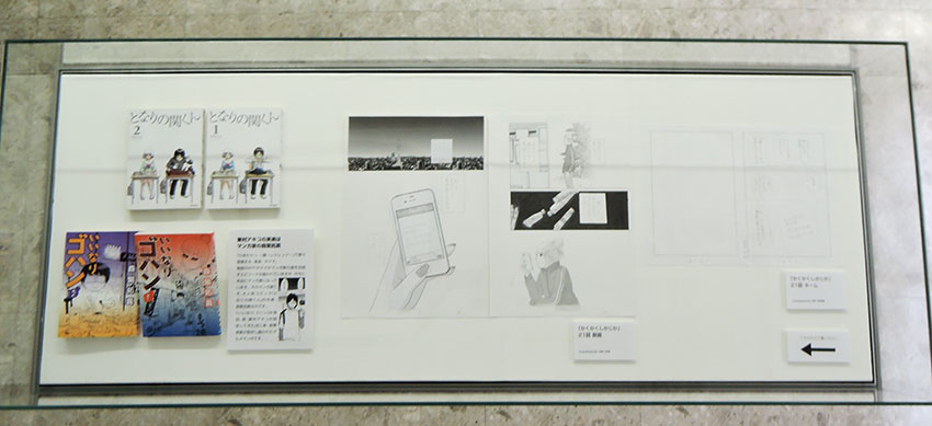 ケース09〜16および壁面左は「かくかくしかじか」特集。日高先生の「描け描け」コーナーと題して、主人公アキコの恩師・日高先生が全身全霊を込めて教えてくれた「描け」というメッセージのあるシーンを集めました。