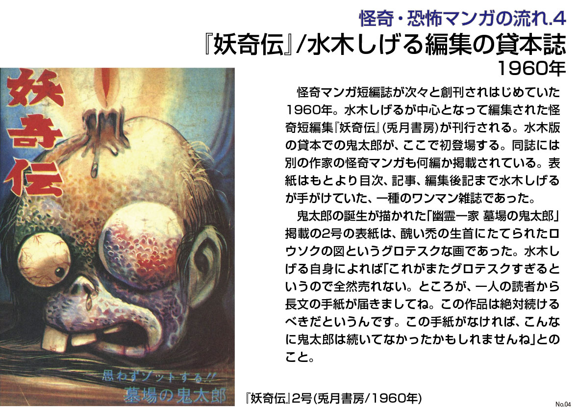 60年、『妖奇伝』(兎月書房)で水木しげるの貸本マンガ版鬼太郎シリーズが誕生し、2号掲載の「幽霊一家 墓場の鬼太郎」には鬼太郎誕生が描かれた。シリーズ3作目「地獄の片道切符」(1960年)からの3作は貸本誌『墓場鬼太郎』(兎月書房)に、さらには三洋社の貸本誌『鬼太郎夜話』(全4巻)へと続いてゆく。一方で兎月書房版の「墓場鬼太郎」は竹内寛行(=竹内八郎、竹内ひろ子、なるみ・寛、鯨一平)によって19巻まで続けられた。鬼太郎シリーズは、65年には『週刊少年マガジン』に進出、66年にはアニメ化を見据えてタイトルを「墓場の鬼太郎」から「ゲゲゲの鬼太郎」に変更。水木亡き今もテレビアニメ第6作が放映されている化け物的ロングセラー作品である。