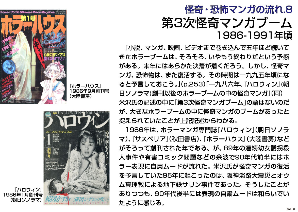 1970年以降の15年間は、個々の作家、つまり、山岸凉子、萩尾望都、あしべゆうほ、山田ミネコ、高階良子、ささやななえ(ななえこ)、山上たつひこ、諸星大二郎、永井豪、池上遼一、和田慎二、日野日出志、わたなべまさこ、美内すずえ、大友克洋、石井やよひ、柿崎普美、竹宮恵子(惠子)、木原敏江、つのだじろう、手塚治虫、石森章太郎、藤子不二雄……と何故かマンガ家として一流の作家の、怪奇の流れにある仕事を見ていけばいい。