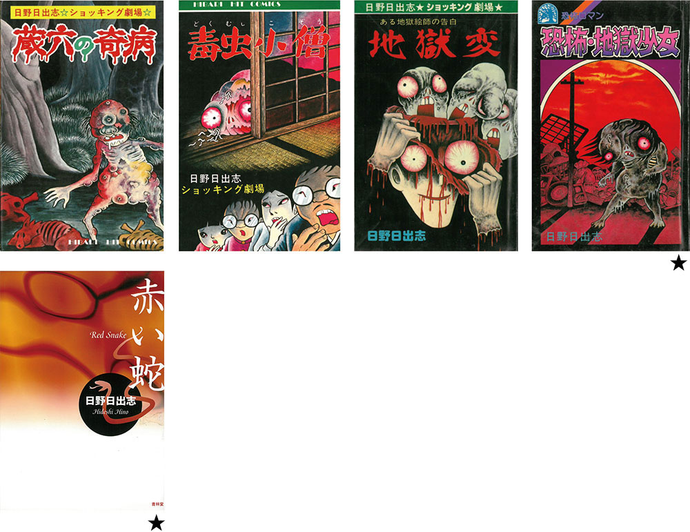 少年誌のラブコメ、青年誌のニューウェーヴ全盛の波には載れず、だんだんと活躍の場所を雑誌から単行本描きおろしに移行。1982年より、新作単行本を一定のペースで刊行。「地獄変」、「赤い蛇」など発表。この二作を米沢は次のように評す。「日野の描く異常な世界は、子宮内の赤ん坊の妄想に似た原初の闇の世界だ。読者を捉えてはなさぬ世界の異様さは、懐しく、だが熱にうかされたような子供の悪夢なのだ。この二作は、そうした日野の作家世界が如実に反映された、マンガでしか描けぬ狂気の美意識に彩られた傑作である。」(p.156)