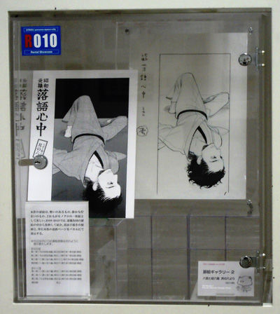 R001から003には「昭和元禄落語心中」掲載誌である、「ITAN」を展示した。講談社発行の「ITAN」は、2010年3月に創刊準備零号が、6月に創刊1号が刊行された。当時のコンセプトは「世界のはじっこを描き出す新しいコミック誌」。誌名には「異端」「畏憚」「異譚」「偉譚」などの意味がこめられている。創刊当初は季刊誌、2012年11号(12月)より隔月刊化した。2013年には、同誌掲載の田中相「千年万年りんごの子」も文化庁メディア芸術祭新人賞を受賞しており、いまや世界のはじっこどころか、マンガ界の中心に躍り出る勢いがある。「昭和元禄落語心中」は零号から連載開始し現在も連載中。創刊から同誌を支えてきた看板作品といえる。ケース手前には雲田はるこが表紙を飾る号を展示した。