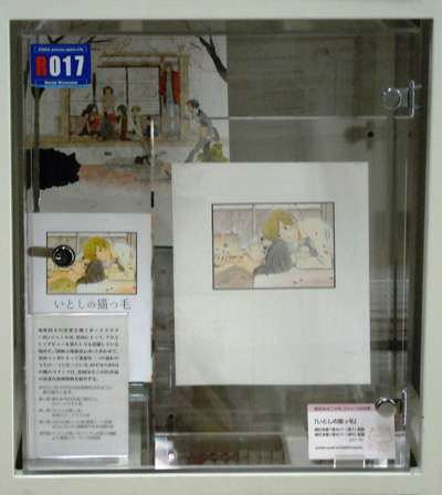 第二期のR017-024のケースには「いとしの猫っ毛」(リブレ出版)のカラー原画を中心に展示する。「いとしの猫っ毛」は現在、単行本3巻までと小樽編で計4冊刊行されている、雲田のBL作品の代表作である。2010年、アンソロジー誌「Citron」VOL.1より連載開始され、2013年に掲載誌を「BE・BOY GOLD」に移した。小さなエピソードのつらなりで日常を描く本作品の連載が、雑誌を移しつつ長く続き巻数をかさねていることは、読み切りで単行本も一冊完結のものの多いBLの世界ではとても人気がある証拠といえる。今回展示した単行本の表紙は、季節が春から始まり夏、秋と続いている。本作が日常の積み重ねを大切にしていることがここからもうかがえる。