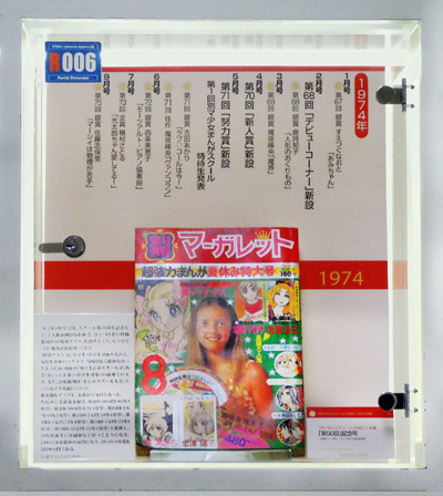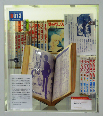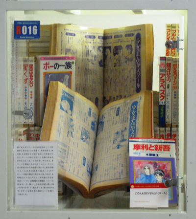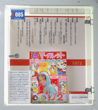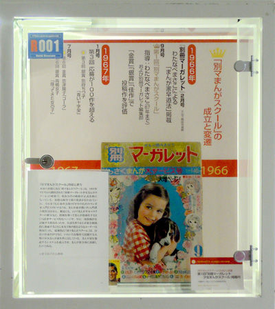 別マまんがスクールの出身者はここでは紹介しきれない。河あきら、沖倉利津子、亜月裕、大谷博子など別マを担った作家たちなど、ケースの中になるべく大勢の作家名がみえるよう並べるのが精一杯である。本ケース左側面にも注目してほしい。そこに並ぶ作家はみな投稿者であった。萩尾望都のように金賞受賞者ではあったがデビューは他の雑誌であるものもいれば、木原敏江のようにデビュー後同誌に作品を発表しつつも、活動場所を移動していった作家もいる。例として萩尾望都(第11回1968年5月号)と、木原としえ(第15回1969年1月号)の金賞受賞の選評ページを開いて展示した。