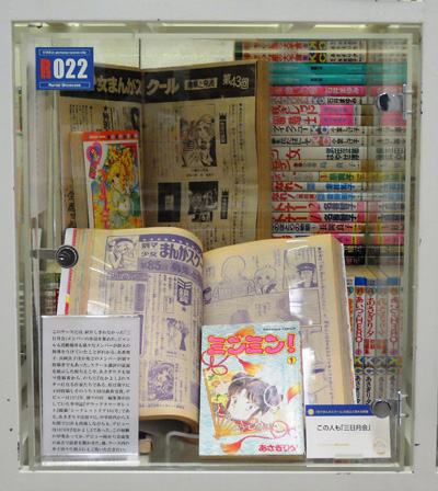 このケースには、紹介しきれなかった「三日月会」メンバーの作品を集めた。ジャンルも活動場所も様々なメンバーが鈴木の指導をうけていたことがわかる。名香智子、長岡良子ほか殆どのメンバーが別マ投稿者でもあった。スクール講評の誌面を展示した原ちえこや、あさぎり夕も別マ投稿者から、のちに『なかよし』のスターになる作家たちである。原は別マに4回投稿しそのうち3回は銀賞受賞。デビューは1972年、別マの同一編集部が出していた季刊誌『デラックスマーガレット』掲載「シークレットドア101号」である。あさぎり夕は別マに、中学時代から5年間で22作も投稿しながらも、デビューは1976年『なかよし』であった。この経験の甲斐あってか、デビュー時から完成度の高さで読者を驚かせた。他、ケース内の多士済々な顔ぶれもご覧いただきたい。