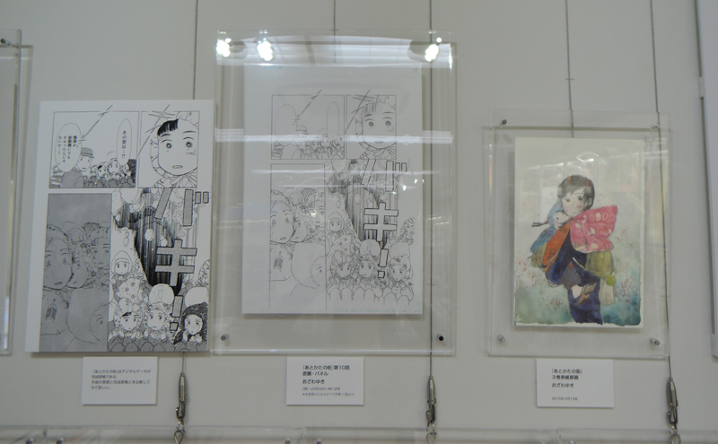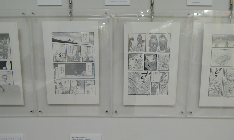 太平洋戦争末期は、本土でも大都市を中心に大規模な空襲に見舞われた。その一つ、名古屋を舞台に、戦時下の日常を生きる家族を、一人の少女の目を通して描く。父親のシベリア抑留の体験をもとに「凍りの掌」を描いた作者が、今度は、名古屋大空襲を生き延びた母親をモデルに、実際に体験していない戦争の記憶を、受け継ぎ、伝える、ということに再び挑む。今回、テーブルケースに展示されているテキストは、作者が母親へのインタビューの文字おこし。本作が持つリアリティーを支える秘密の一端である。