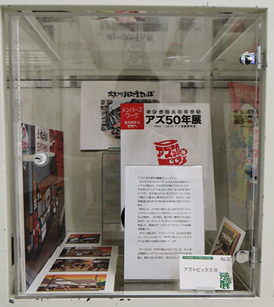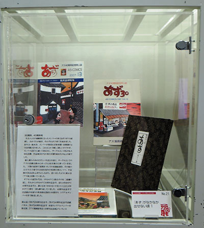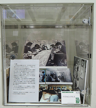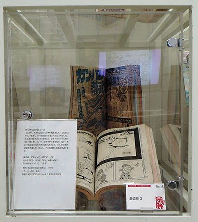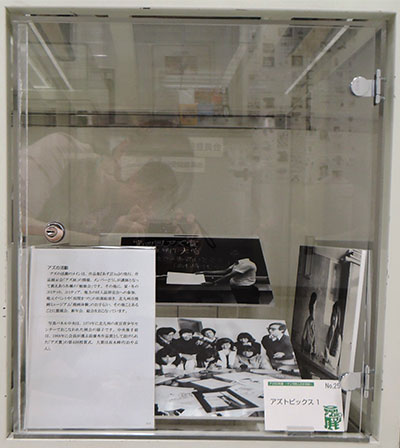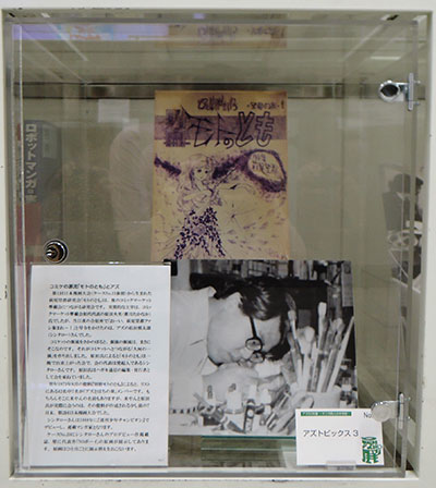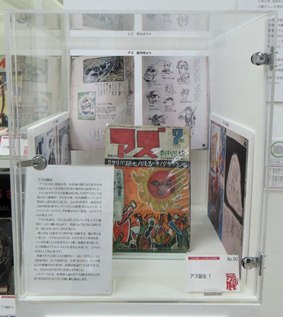 ケースには、今回の展示のもととなった、北九州市漫画ミュージアムでおこなわれた『アズ50年展』図録と、畑たいむの仕事の一部を紹介しています。