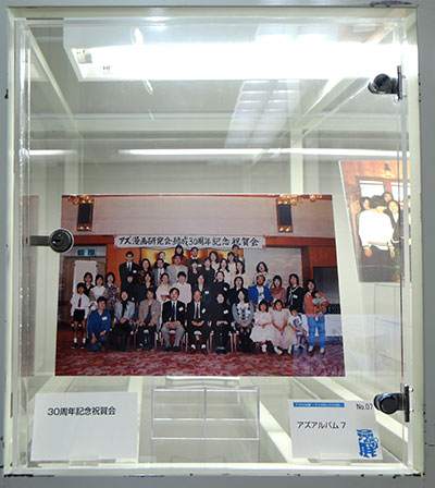 写真パネル中央は、1978年に北九州の夜宮青少年センターでおこなわれた例会の様子です。中央後手前は、1968年に会員が選ぶ最優秀作品賞として設けられた「アズ賞」の第4回授賞式。大賞は高木峰代(おやぶん)。