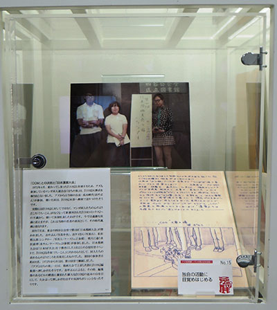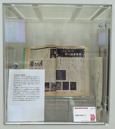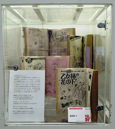 ケースに展示したのは、マコ姉のデビュー作「17歳の冒険」掲載誌(『別冊セブンティーン』12月号)。アキさんの入選2作「白い心」(『COM』1968年5月号)、「風」(『COM』1968年12月号)選評パネル、やはりアキさんの「ひととせの」掲載誌(1971年『COM』8月号)。おケイさんの「まんが予備校」入選(1971年『COM』5 ・6月合併号)選評パネル。