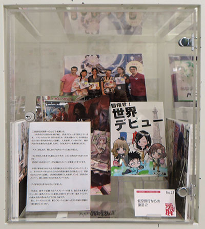 写真は、海外で活躍するアズメンバーの様子。『めざせ世界デビュー』は、海外のイベントに参加した時のレポートや、海外イベントへの参加方法が書かれたアズの同人誌です。