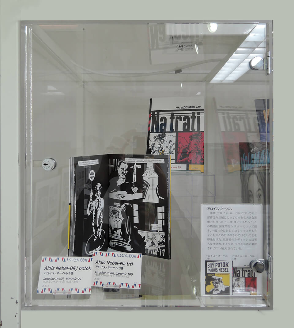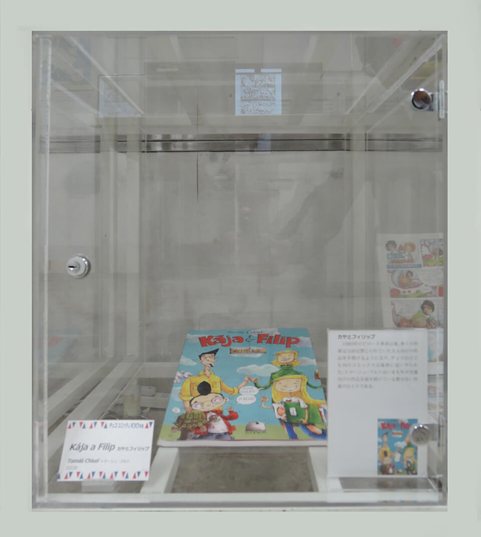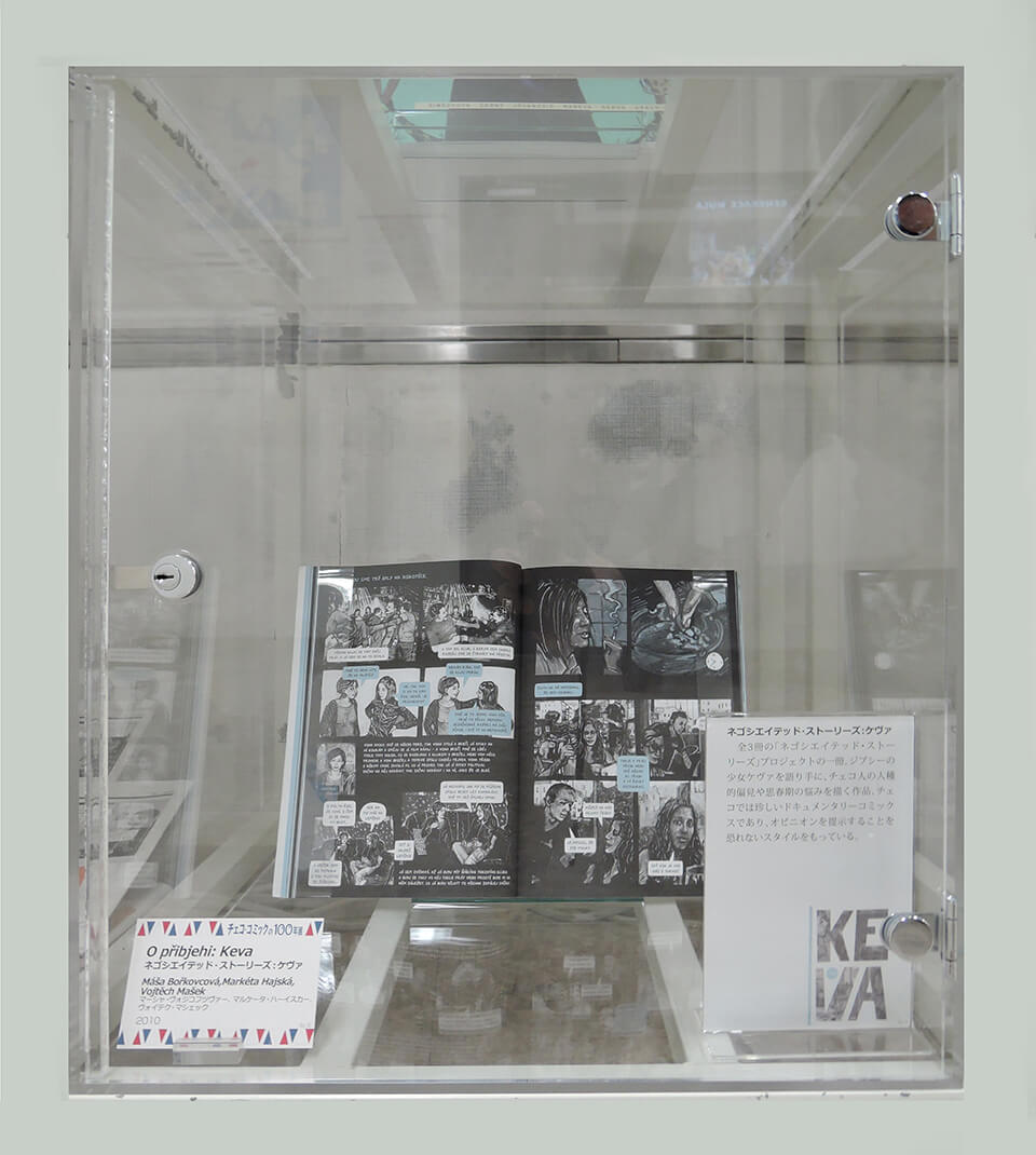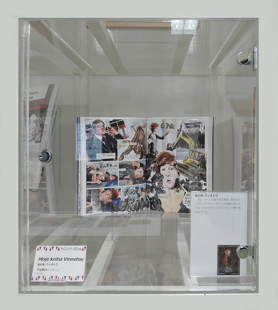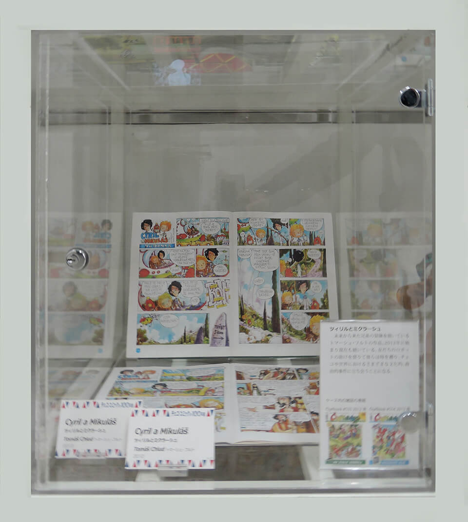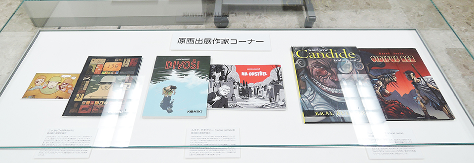 このコーナーでは、現代チェコ・コミックを代表する作家たちを特集し紹介した。会期ごとにひとりの作家をピックアップし、壁で原画展示を行い、中央の覗き込みケースでは残り3人の現代作家を書籍とともに紹介した。