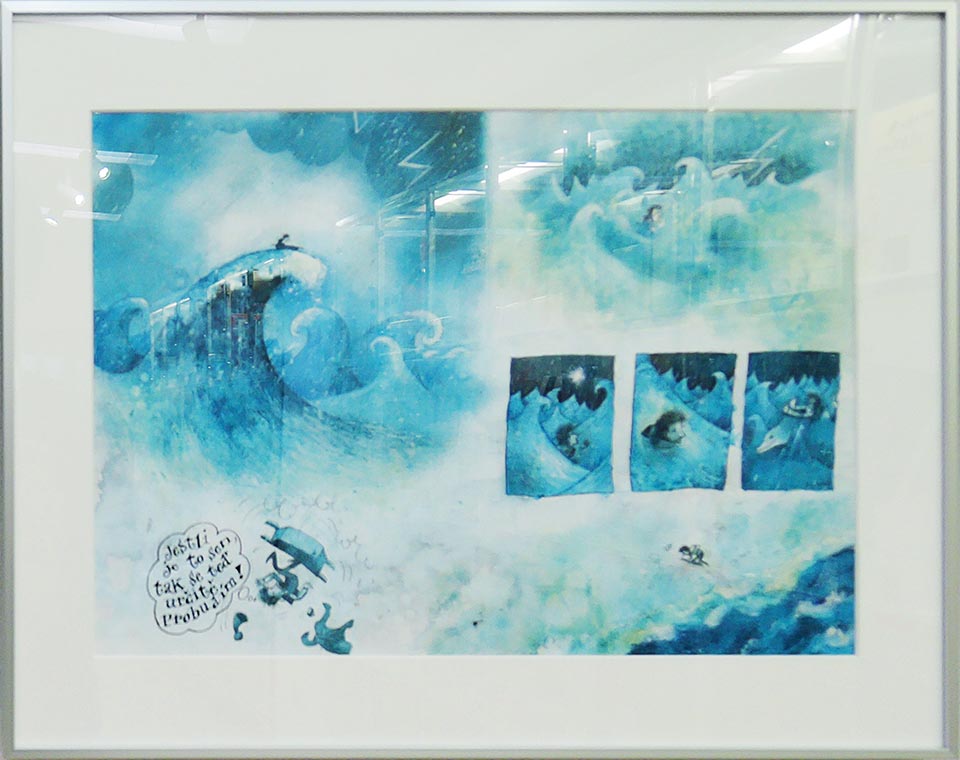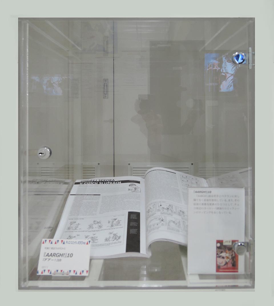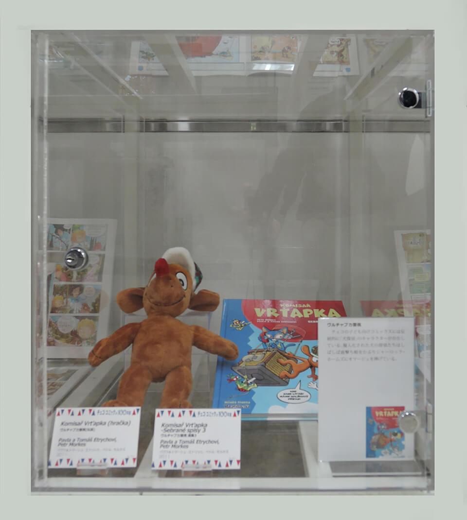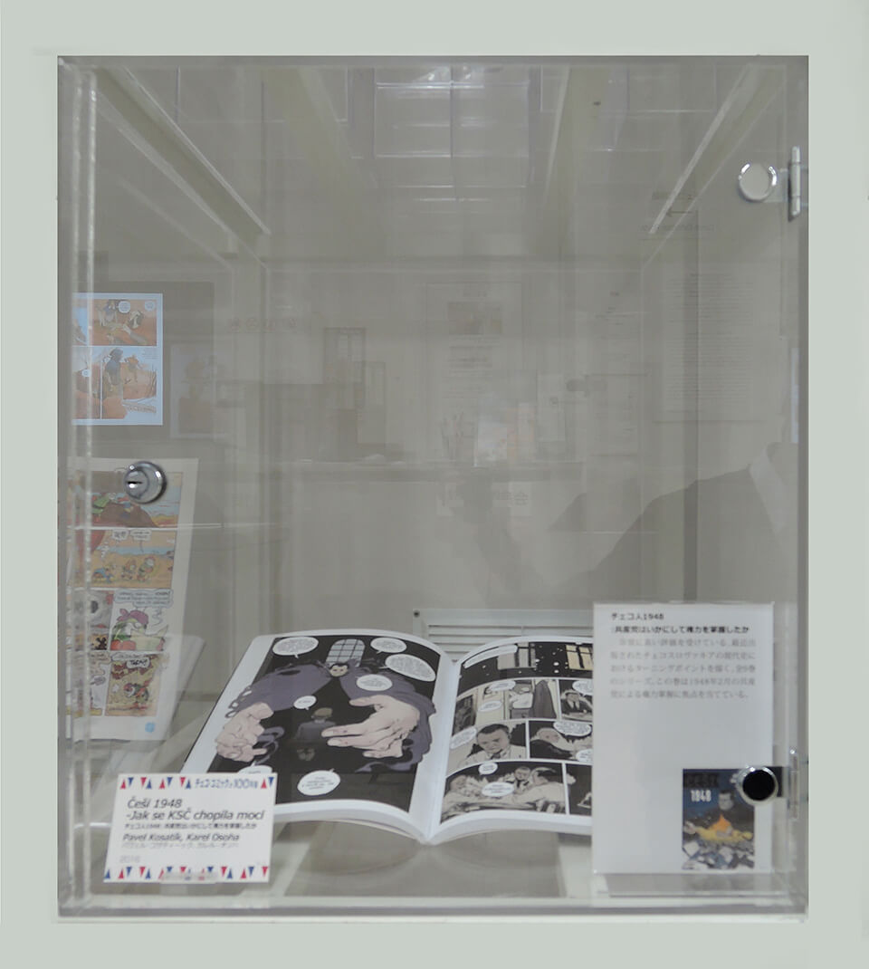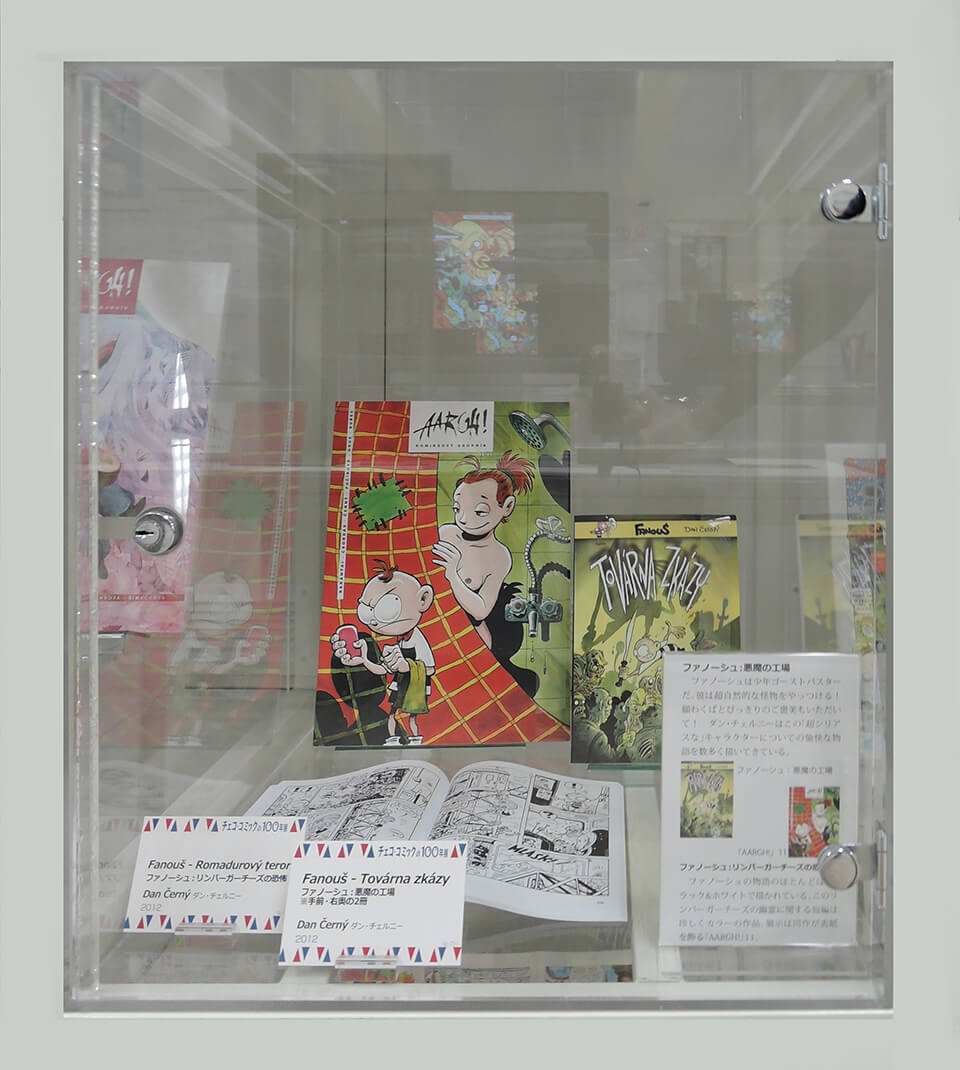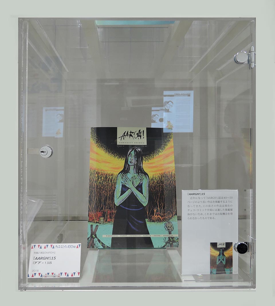 このコーナーでは、現代チェコ・コミックを代表する作家たちを特集し紹介した。会期ごとにひとりの作家をピックアップし、壁で原画展示を行い、中央の覗き込みケースでは残り3人の現代作家を書籍とともに紹介した。