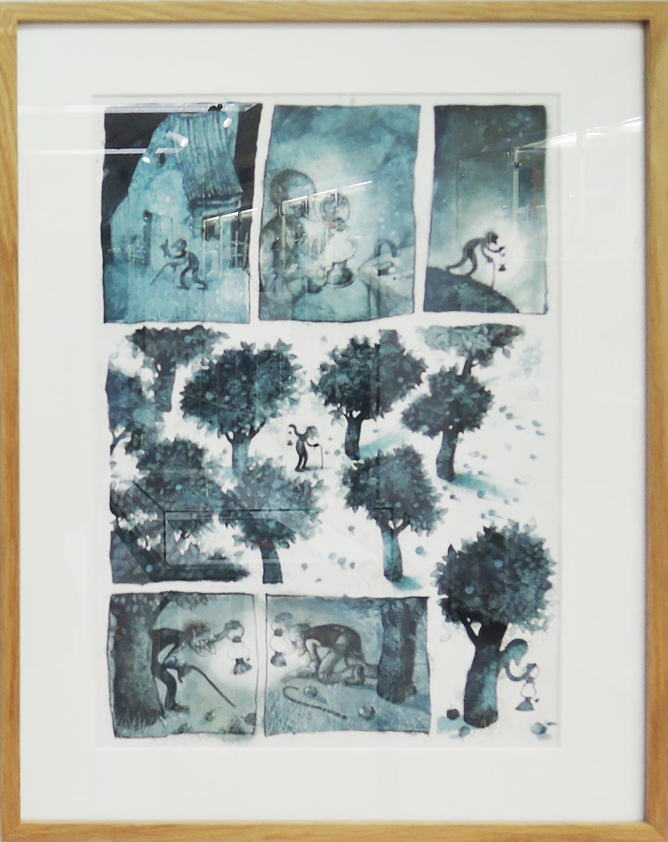 2011年の短編コミック集『おじいちゃんたち』(Dědečkové)で、パヴェル・チェフは、老人の生活に対して、詩的でノスタルジックな見方を提示する。体力は落ちたとしても、小さな喜びを見出し楽しむ彼らの意志が尊重される。展示されたページは、真夜中に老人が リンゴ畑に星を拾いに行くストーリー、「星」(Hvězda)より。