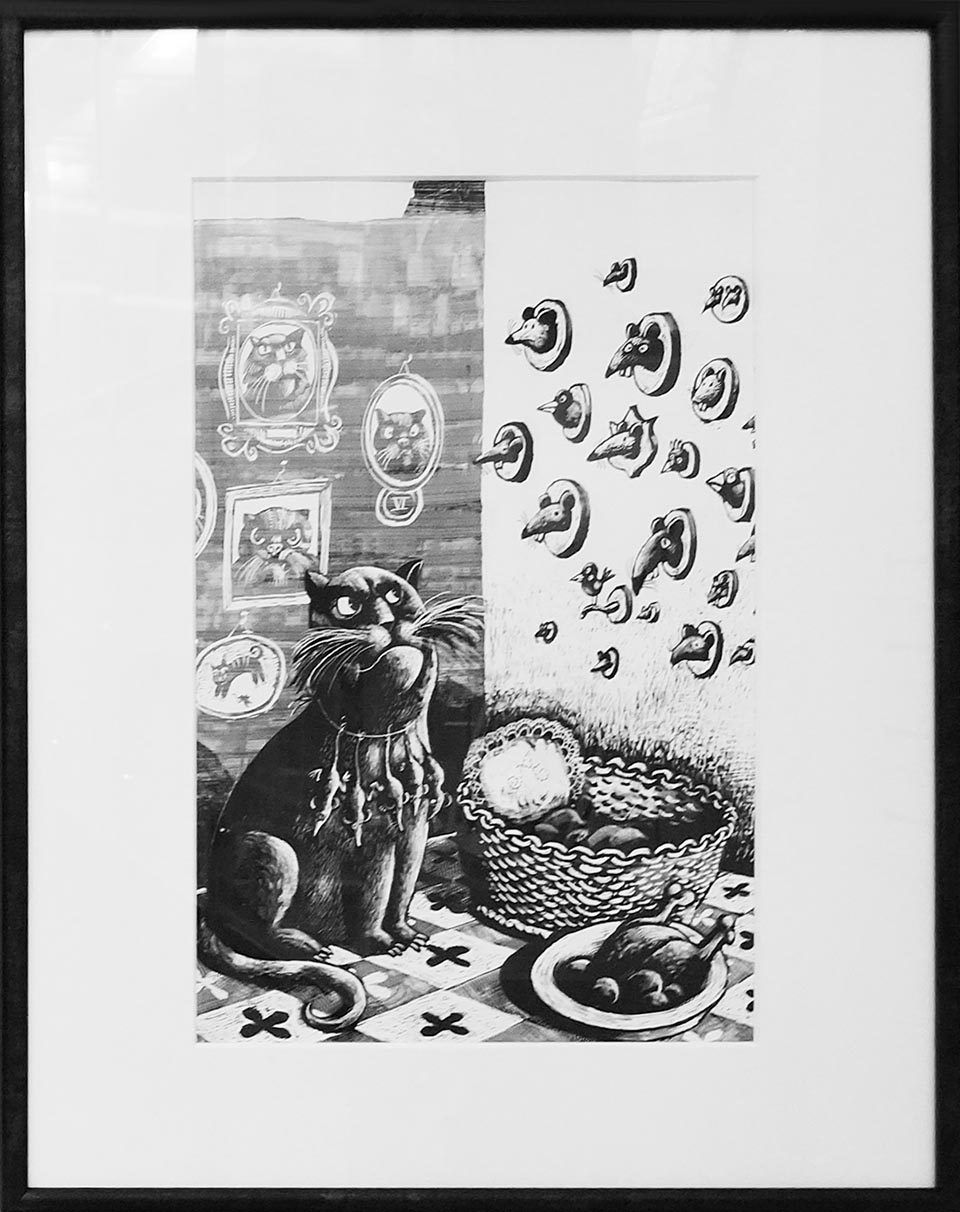 猫(アルフレッド)とネズミ(キビド)の競争についての古くからの民話をモチーフに、興味深いひねりを加えた近年の絵本。古典的な冒険物語やマンガがいっぱい収蔵されている図書館で、二匹が争うのがこの本の魅力の一つ。このイラストの活き活きしていること! これは、アルフレッドが誇らしげに自分の獲物コレクションを飾っているところである。 キビドの頭は次の尊い獲物になってしまうのだろうか?