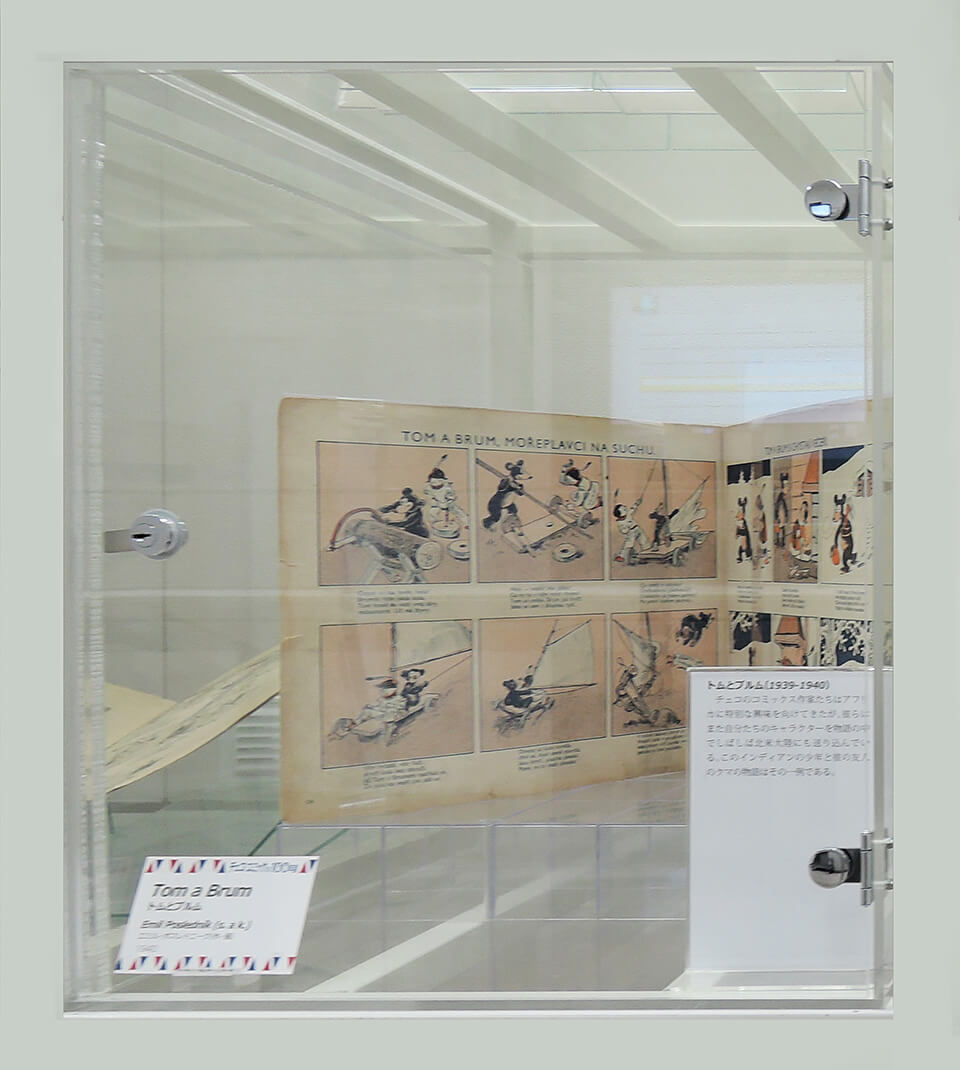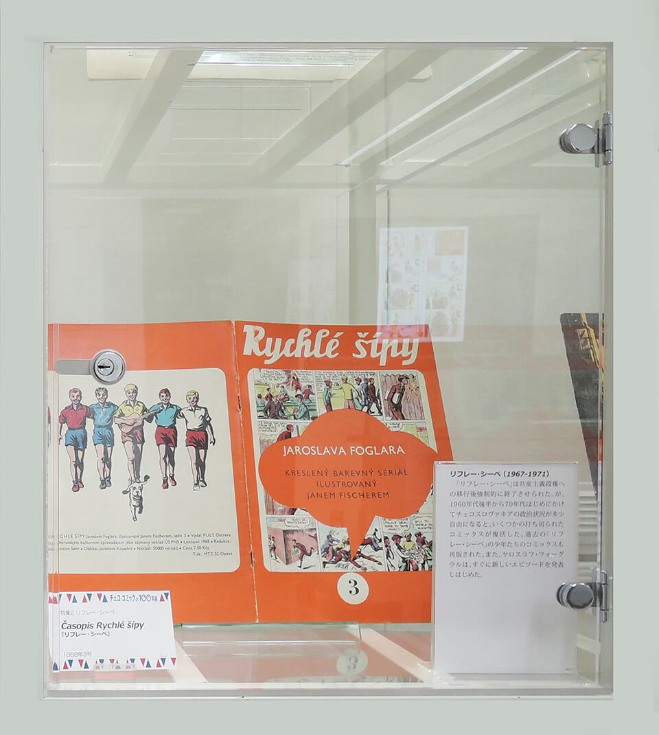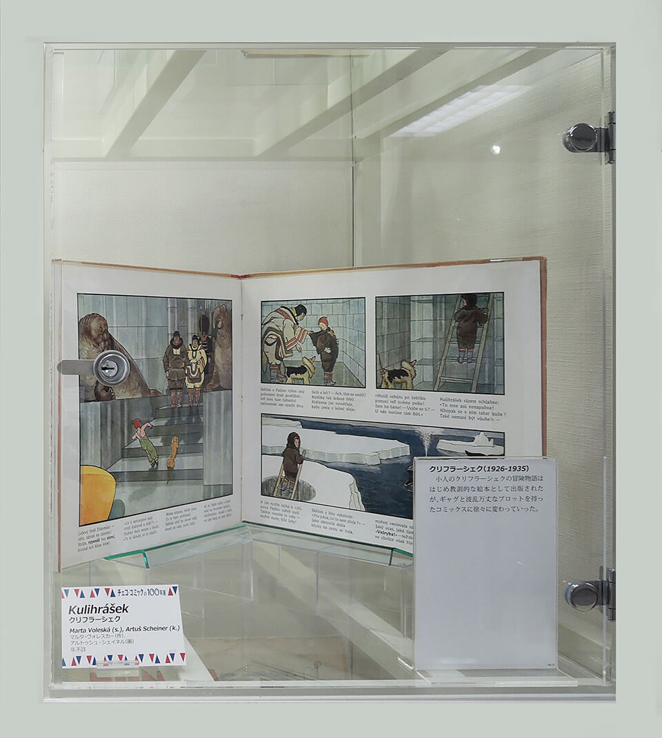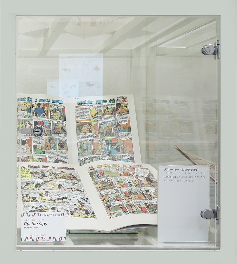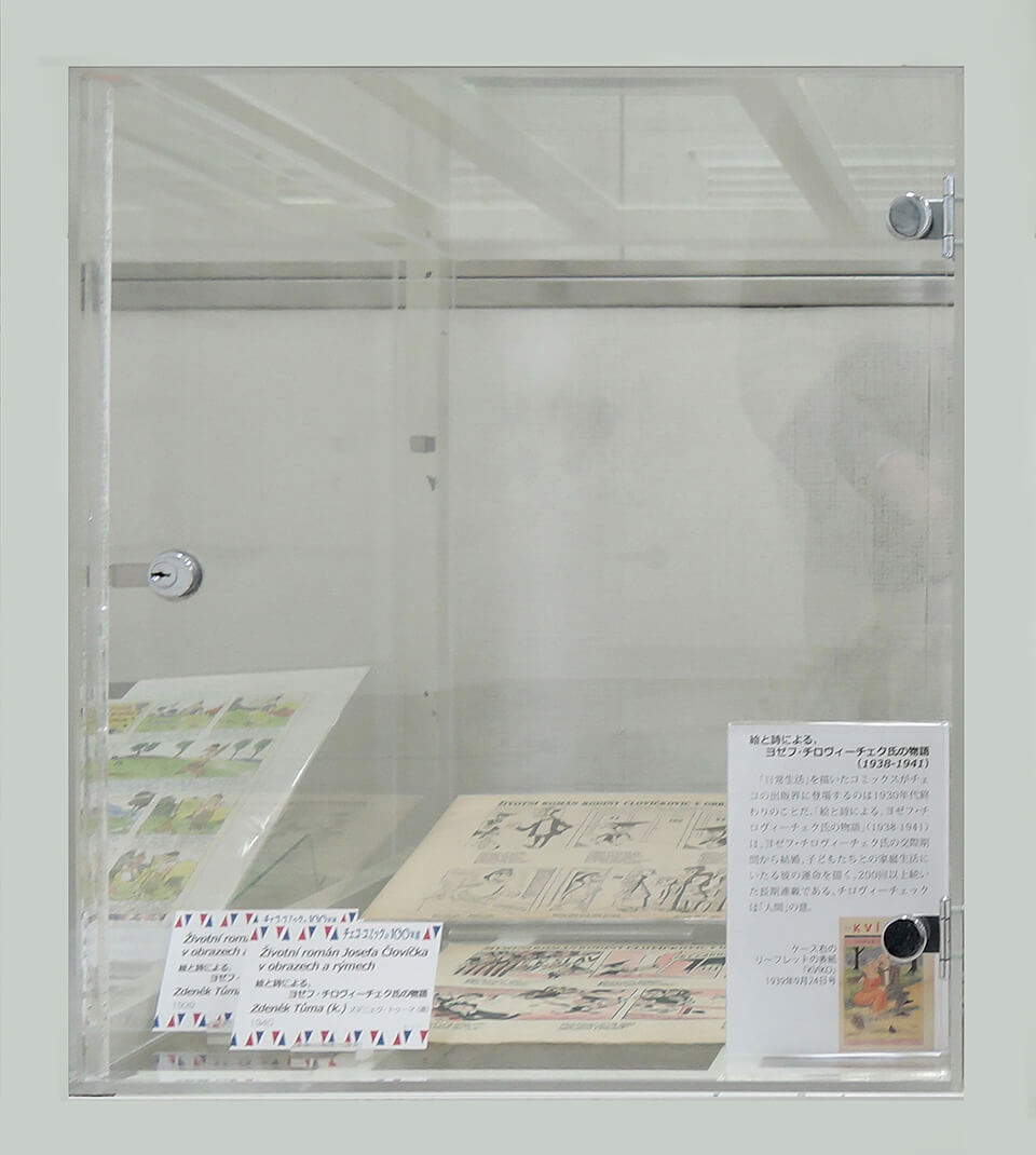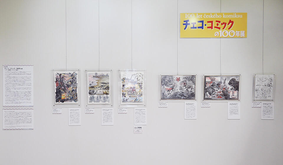 このコーナーでは、現代チェコ・コミックを代表する作家たちを特集し紹介した。会期ごとにひとりの作家をピックアップし、壁で原画展示を行い、中央の覗き込みケースでは残り3人の現代作家を書籍とともに紹介した。