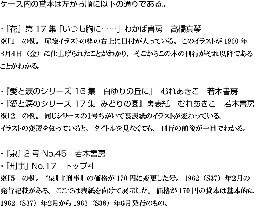 貸本マンガの発行年度の推定法はいくつかある。まず、A5判並製本(ソフトカバー)の単行本や短編誌であれば、基本的には1960年以降の刊行ということになる。以下は、A5並製本の発行年度の確定方法ということになる。