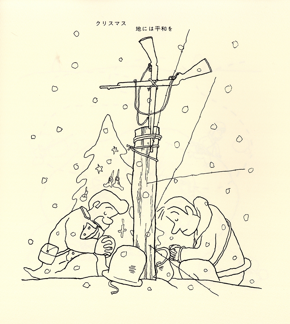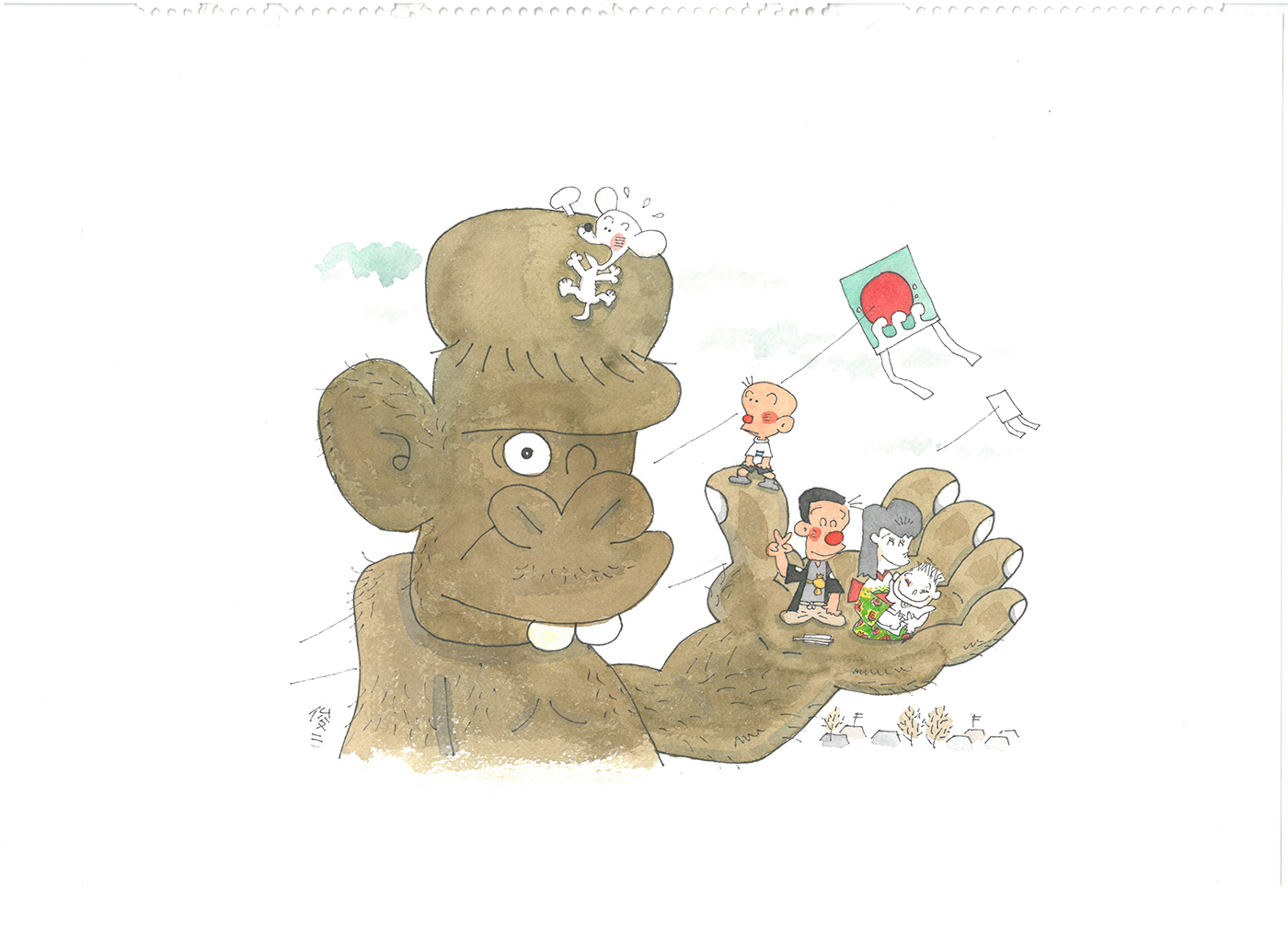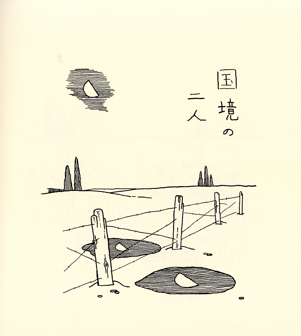 デビューして数年間、園山俊二は子供マンガだけを描いていましたが、大人に向けたマンガも描きたいという希望を持っていました。そこで、「がんばれゴンべ」以外の連載を思い切ってすべてやめて、一人で世界一周旅行に出ました。この旅行で得た経験と、それまで考えていたことやアイデアをまとめて自費出版したのが「国境の二人」です。そしてこれを契機に、大人マンガへの挑戦をはじめた園山にとっての転機となる、重要な作品です。内容の面でも、国家間の争いを目にして、平和を願い、自由を制限するものへの反抗という、この後繰り広げられる園山マンガの世界を彷彿とさせています。